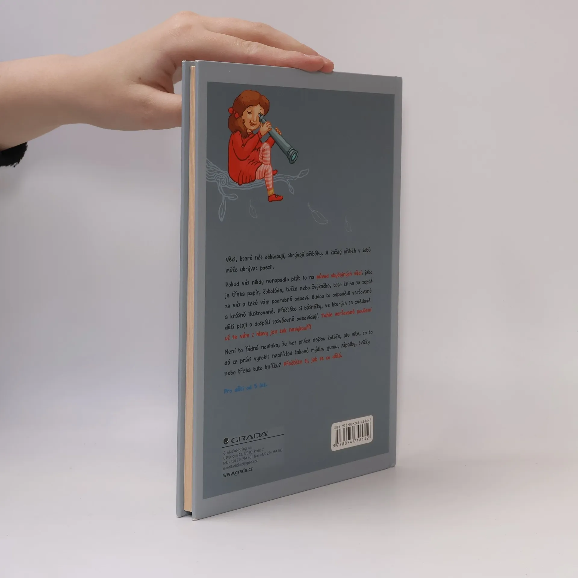 Pokud vás nikdy nenapadlo ptát se na původ obyčejných věcí, jako je třeba papír, čokoláda, tužka nebo žvýkačka, tato kniha se zeptá za vás a také vám podrobně odpoví. Budou to odpovědi veršované a krásně ilustrované. Přečtěte si básničky, ve kterých se zvědavé děti ptají a dospělí zasvěceně odpovídají. Tohle veršované poučení už se vám z hlavy jen tak nevykouří! Pro děti od 5 let.