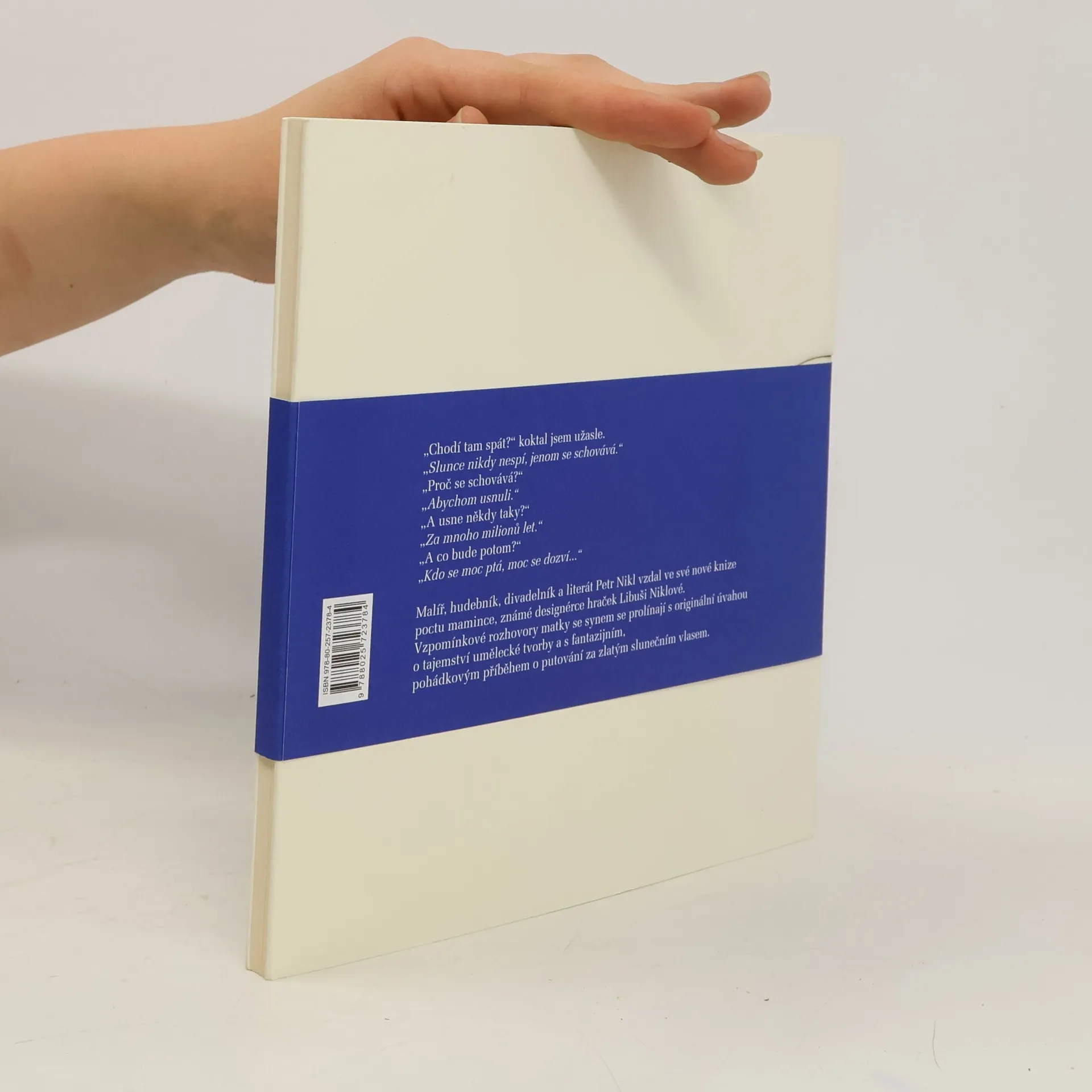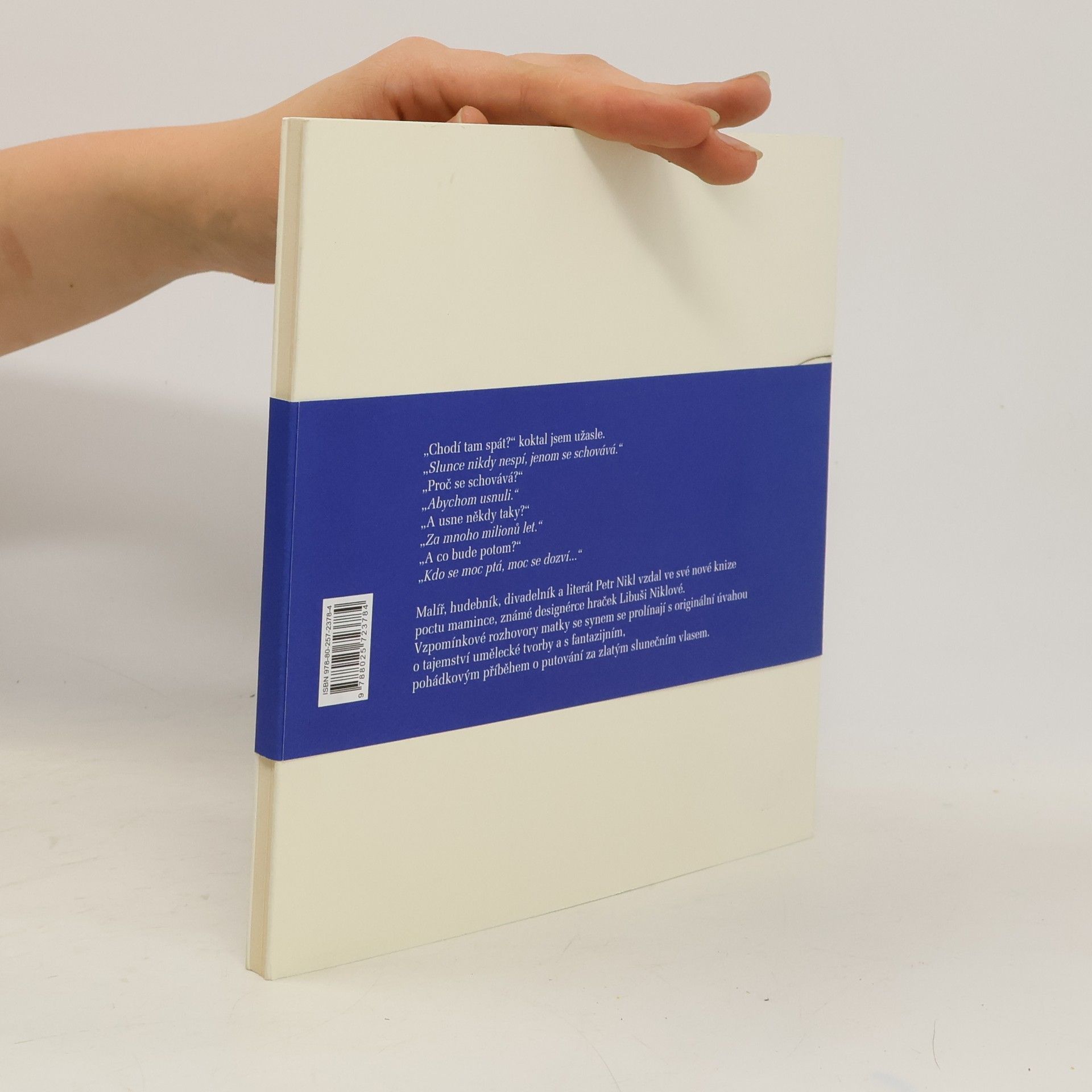 Malíř, hudebník, divadelník a literát Petr Nikl vzdal ve své nové knize poctu mamince, známé designérce hraček Libuši Niklové. Vzpomínkové rozhovory matky se synem se prolínají s originální úvahou o tajemství umělecké tvorby a s fantazijním, pohádkovým příběhem o putování za zlatým slunečním vlasem. Kniha má výjimečnou minimalistickou grafickou podobu.