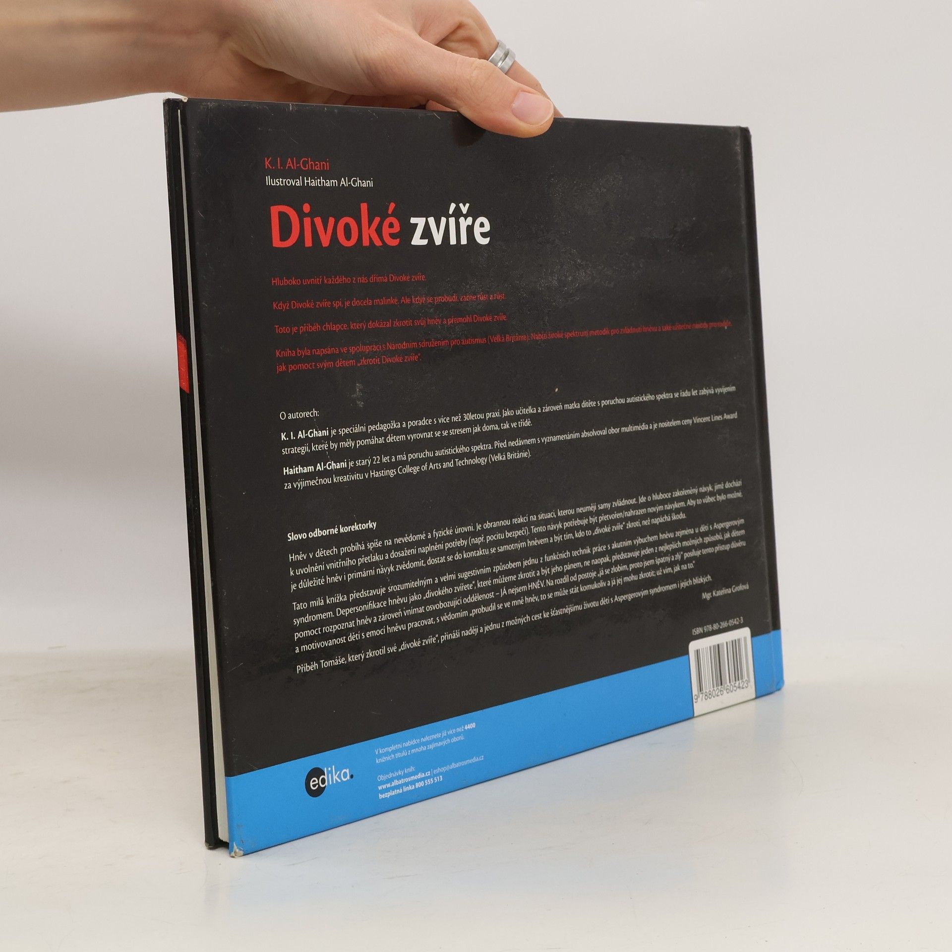 Tato milá knížka představuje srozumitelným a velmi sugestivním způsobem jednu z funkčních technik práce s akutním výbuchem hněvu zejména u dětí s Aspergerovým syndromem. Depersonifikace hněvu jako „divokého zvířete“, které můžeme zkrotit a být jeho pánem, představuje jeden z nejlepších možných způsobů, jak dětem pomoct rozpoznat hněv a zároveň vnímat osvobozující oddělenost – JÁ nejsem HNĚV. Tento přístup posiluje důvěru a motivovanost dětí s emocí hněvu pracovat, s vědomím „probudil se ve mně hněv, to se může stát komukoliv a já jej mohu zkrotit; už vím, jak na to.“ Příběh Tomáše, který zkrotil své „divoké zvíře“, přináší naději a jednu z možných cest ke šťastnějšímu životu dětí s Aspergerovým syndromem i jejich blízkých. Kniha byla napsána ve spolupráci s Národním sdružením pro autismus (Velká Británie). Nabízí široké spektrum metodik pro zvládnutí hněvu a také užitečné návody pro rodiče, jak pomoct svým dětem „zkrotit Divoké zvíře“. O autorech: K. I. Al-Ghani je speciální pedagožka