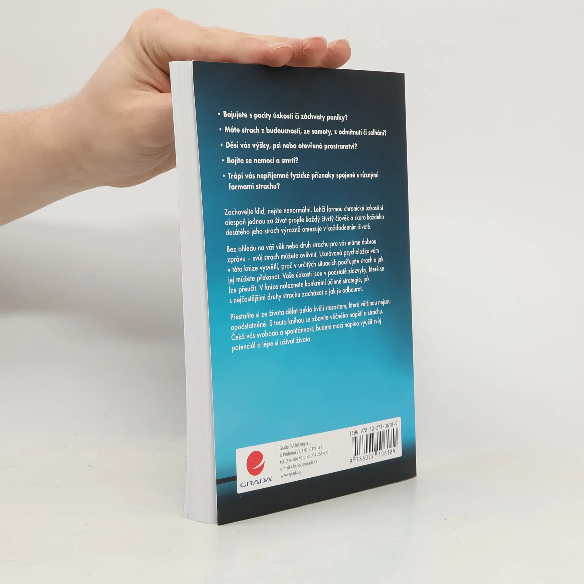 Bojujete s pocity úzkosti či záchvaty paniky? Máte strach z budoucnosti, ze samoty, z odmítnutí či selhání? Děsí vás výšky, psi nebo otevřená prostranství? Bojíte se nemocí a smrti? Trápí vás nepříjemné fyzické příznaky spojené s různými formami strachu? Zachovejte klid, nejste nenormální. Lehčí formou chronické úzkosti si alespoň jednou za život projde každý čtvrtý člověk a skoro každého desátého jeho strach výrazně omezuje v každodenním životě. Bez ohledu na váš věk nebo druh strachu pro vás máme dobrou zprávu – svůj strach můžete ovlivnit. Uznávaná psycholožka vám v této knize vysvětlí, proč v určitých situacích pociťujete strach a jak jej můžete překonat. Vaše úzkosti jsou v podstatě zlozvyky, které se lze přeučit. V knize naleznete konkrétní účinné strategie, jak s nejčastějšími druhy strachu zacházet a jak je odbourat. Přestaňte si ze života dělat peklo kvůli starostem, které většinou nejsou opodstatněné. S touto knihou se zbavíte věčného napětí a strachu. Čeká vás svoboda a spontánnost, budete moci naplno využít svůj potenciál a lépe si užívat života.