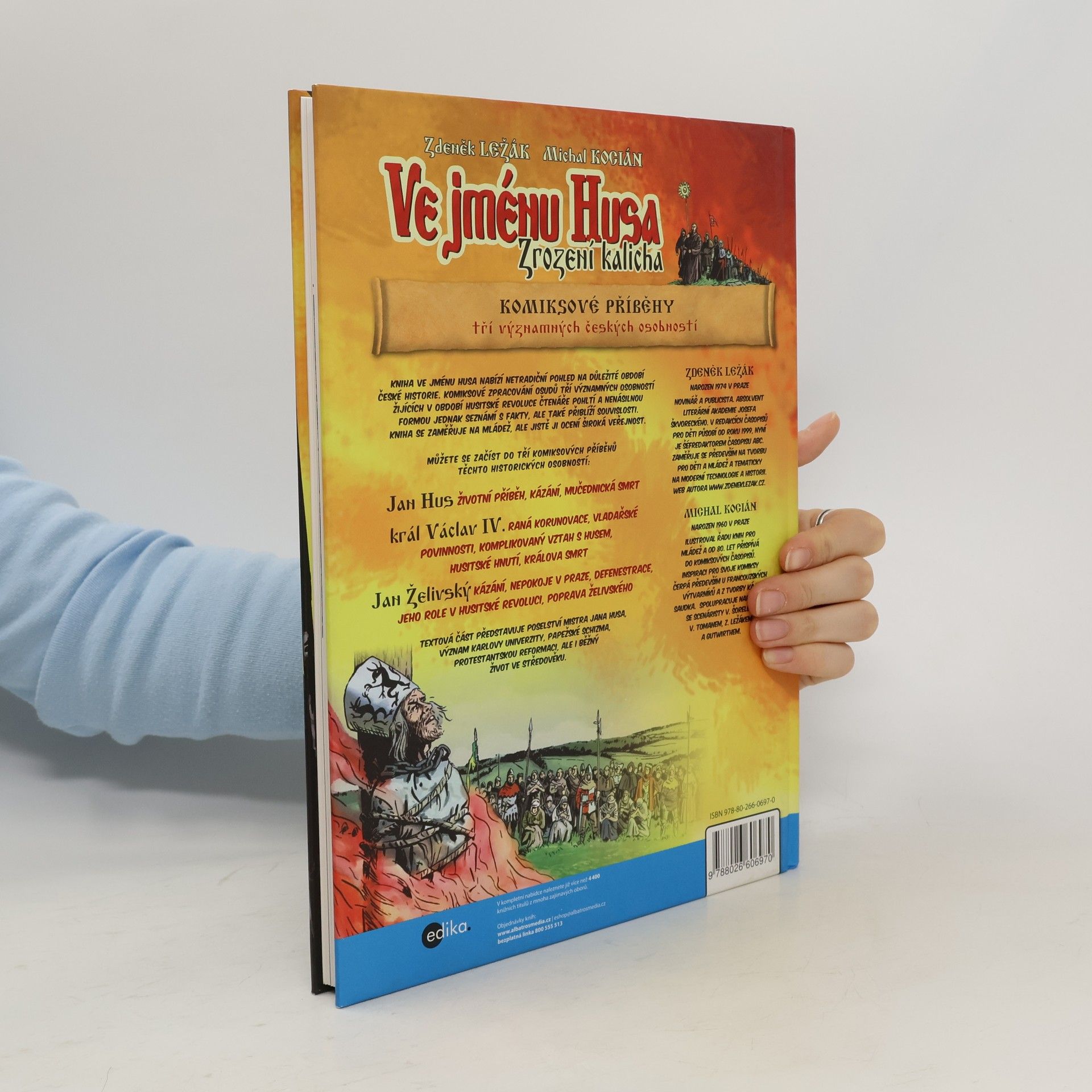 Kniha nabízí netradiční pohled na důležité období české historie prostřednictvím komiksového zpracování osudů tří významných osobností z doby husitské revoluce. Čtenáři se seznámí s fakty a souvislostmi, a to nejen formou příběhů, ale i prostřednictvím textové části, která přináší poselství mistra Jana Husa, význam Karlovy univerzity, papežský koncil, protestantskou reformaci a běžný život ve středověku. Tři komiksové příběhy se zaměřují na: Jan Husa, jehož životní příběh zahrnuje kázání a mučednickou smrt; krále Václava IV., jehož raná korunovace, vladařské povinnosti a komplikovaný vztah s Husem vedou k jeho smrti; a Jana Želivského, jehož kázání a role v revoluci vyvrcholí defenestrací a popravou. Kniha je určena mládeži, ale jistě osloví i širokou veřejnost. Autory jsou Zdeněk Ležák, novinář a publicista, zaměřující se na dětskou literaturu a historii, a Michal Kocián, ilustrátor s bohatou zkušeností v komiksové tvorbě, inspirovaný francouzskými výtvarníky.