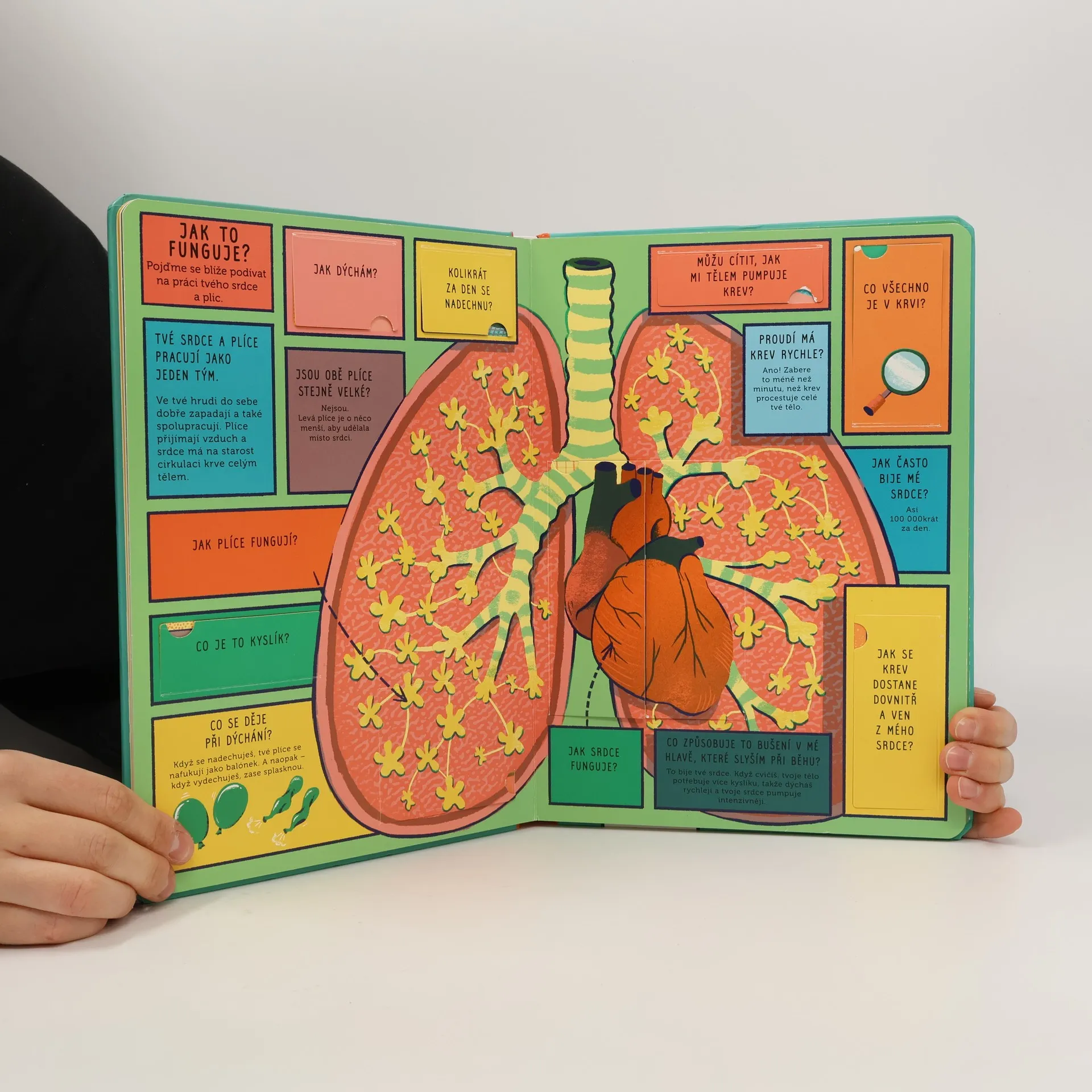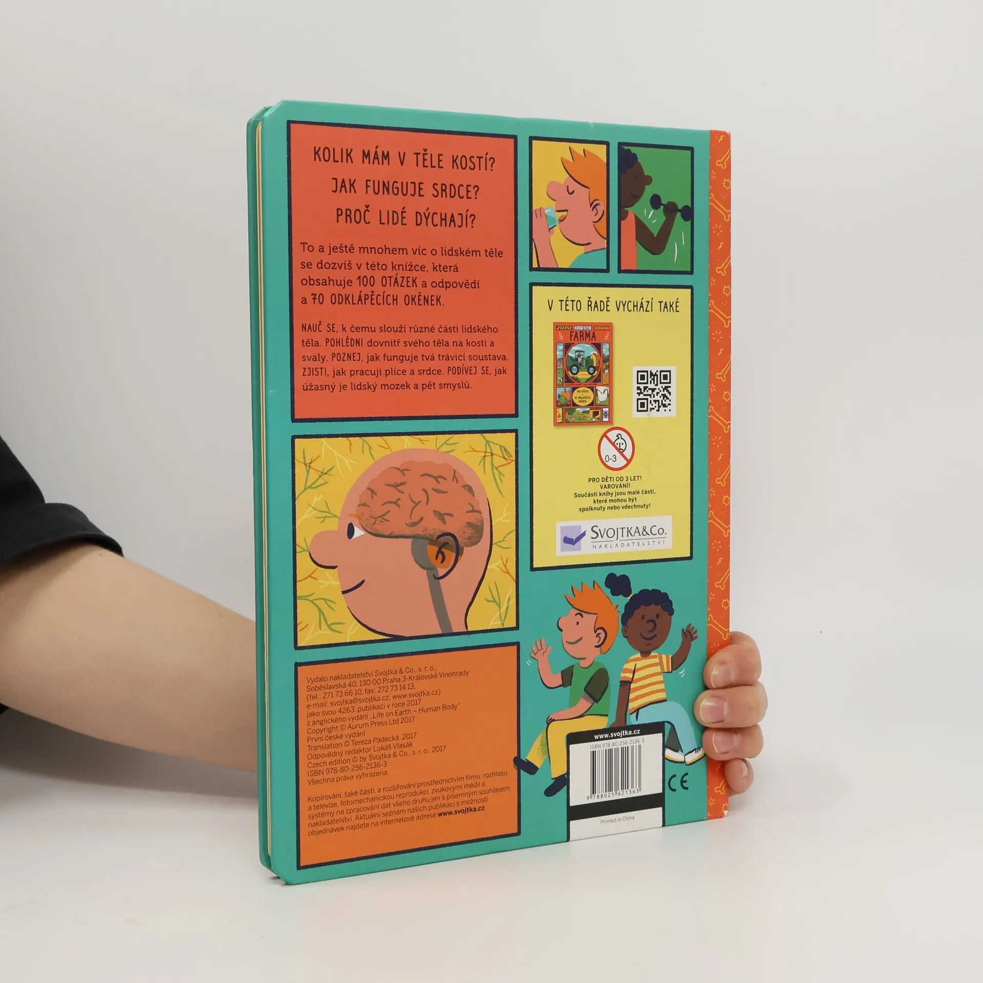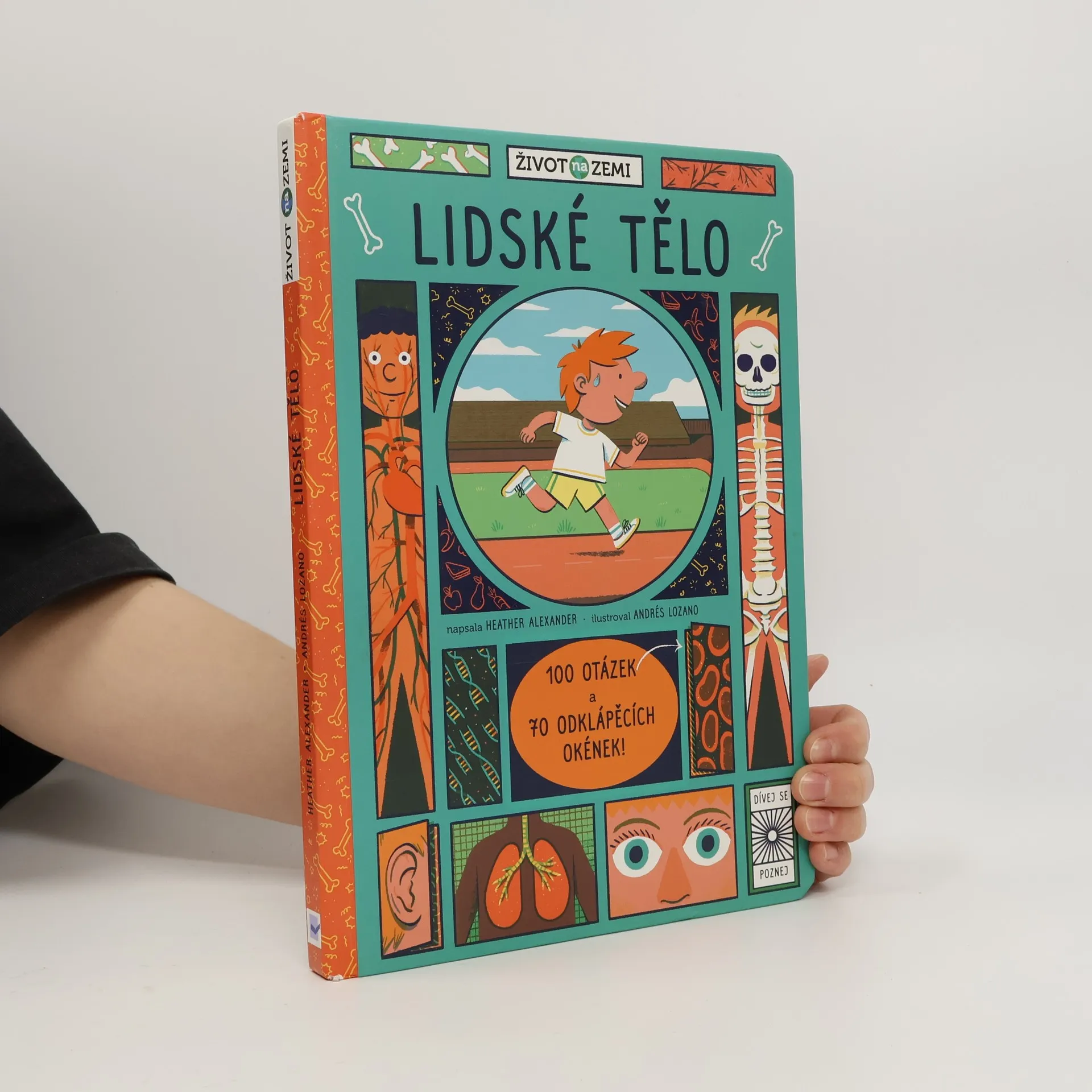 Poznej, k čemu slouží různé části lidského těla, v knížce, která obsahuje 100 otázek a odpovědí a 70 odklápěcích okének. Kolik máš v těle kostí? Jak funguje srdce? Proč lidé dýchají? To a ještě mnohem víc o lidském těle se dozvíš v této knížce, která obsahuje 100 otázek a odpovědí a 70 odklápěcích okének. Poznej, k čemu slouží různé části lidského těla. Nakoukni dovnitř svého těla na kosti a svaly. Nauč se, jak funguje tvá trávicí soustava. Zjisti, jak pracují plíce a srdce. Podívej se, jak úžasný je lidský mozek a pět smyslů.