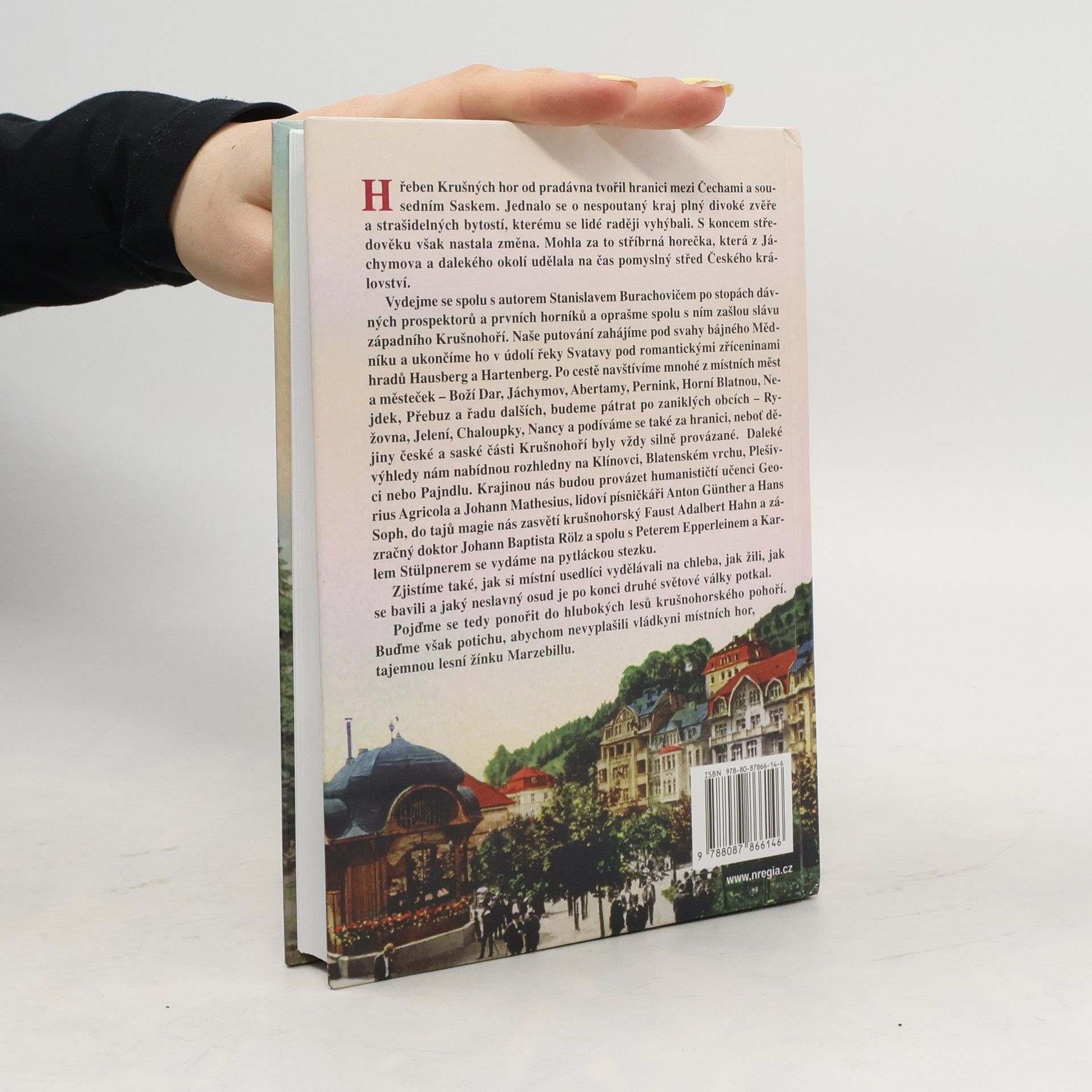 Hřeben Krušných hor od pradávna tvořil hranici mezi Čechami a Saskem, byl to kraj plný divoké zvěře a strašidelných bytostí, kterému se lidé raději vyhýbali. S koncem středověku však nastala změna, způsobená stříbrnou horečkou, která učinila z Jáchymova pomyslný střed Českého království. Autor Stanislav Burachovič nás zve na cestu po stopách dávných prospektorů a prvních horníků, abychom objevili zašlou slávu západního Krušnohoří. Naše putování začíná pod svahy Mědníku a končí v údolí řeky Svatavy pod romantickými zříceninami hradů Hausberg a Hartenberg. Navštívíme města jako Boží Dar, Jáchymov, Abertamy, Pernink, Horní Blatnou a Nejdek, a prozkoumáme zaniklé obce jako Rýžovna a Jelení. Dějiny české a saské části Krušnohoří jsou silně provázané, což nás zavede i za hranice. Rozhledny na Klínovci, Blatenském vrchu a Plešivci nám nabídnou daleké výhledy. Na cestě nás provázejí historické postavy, lidoví písničkáři a tajemní léčitelé. Objevíme, jak místní obyvatelé žili, jak se bavili a jaký osud je potkal po druhé světové válce. Ponořme se do hlubokých lesů Krušných hor, ale buďme potichu, abychom nevyplašili vládkyni místních hor, tajemnou lesní žínku Marzebillu.