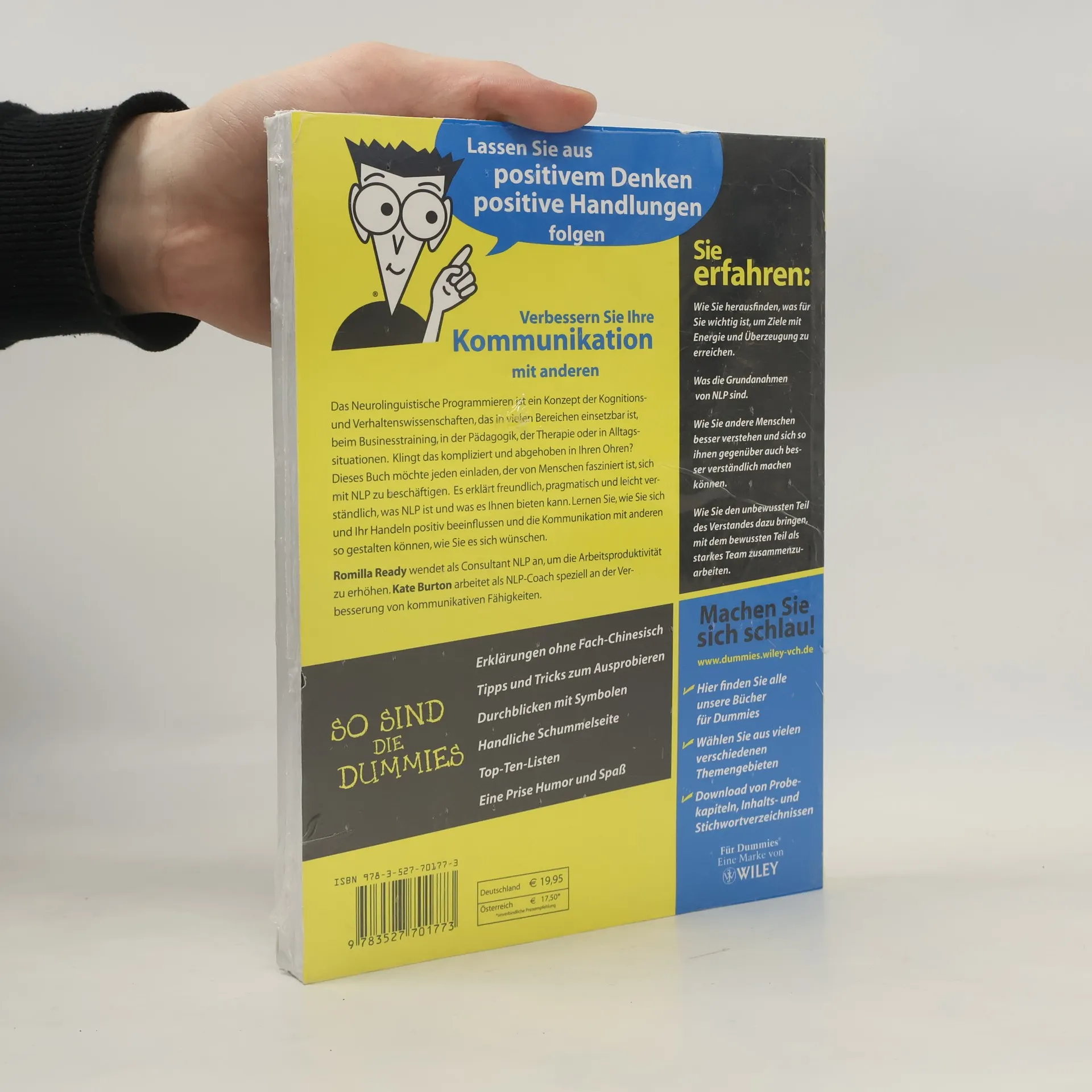 Das Neuro-Linguistische Programmieren ist ein Konzept der Kognitions- und Verhaltenswissenschaften, das in vielen Bereichen einsetzbar ist, ob beim Businesstraining, in der Pädagogik, der Therapie oder in Alltagssituationen. NLP hilft Kommunikation mit anderen, aber auch sich selbst besser zu verstehen: Es bietet Fragetechniken, die dabei helfen, die Kommunikation mit anderen so zu gestalten, wie Sie es wünschen und sich selbst und Ihr Handeln positiv zu beeinflussen. Romilla Ready vermittelt in diesem Buch die Methode des NLP auf verständliche und humorvolle Weise. Einfache Ideen wie „Anker setzen“, „Zeitreise“ oder „Kongruenz“ führen zu erstaunlichen Ergebnissen, mit deren Hilfe der Leser sein Leben und Arbeiten neu strukturieren und bessere Beziehungen eingehen kann. Sie erfahren: Wie Sie herausfinden, was wichtig für Sie ist, um Ziele mit Energie und Überzeugung zu erreichen. Was die grundlegenden Vorannahmen des NLP sind und warum sie für Sie wichtig sind. Wie Sie andere Menschen besser verstehen und sich so ihnen gegenüber auch besser verständlich machen können. Wie Sie den unbewussten Teil des Verstandes dazu bringen mit dem bewussten Teil als starkes Team zusammenzuarbeiten.