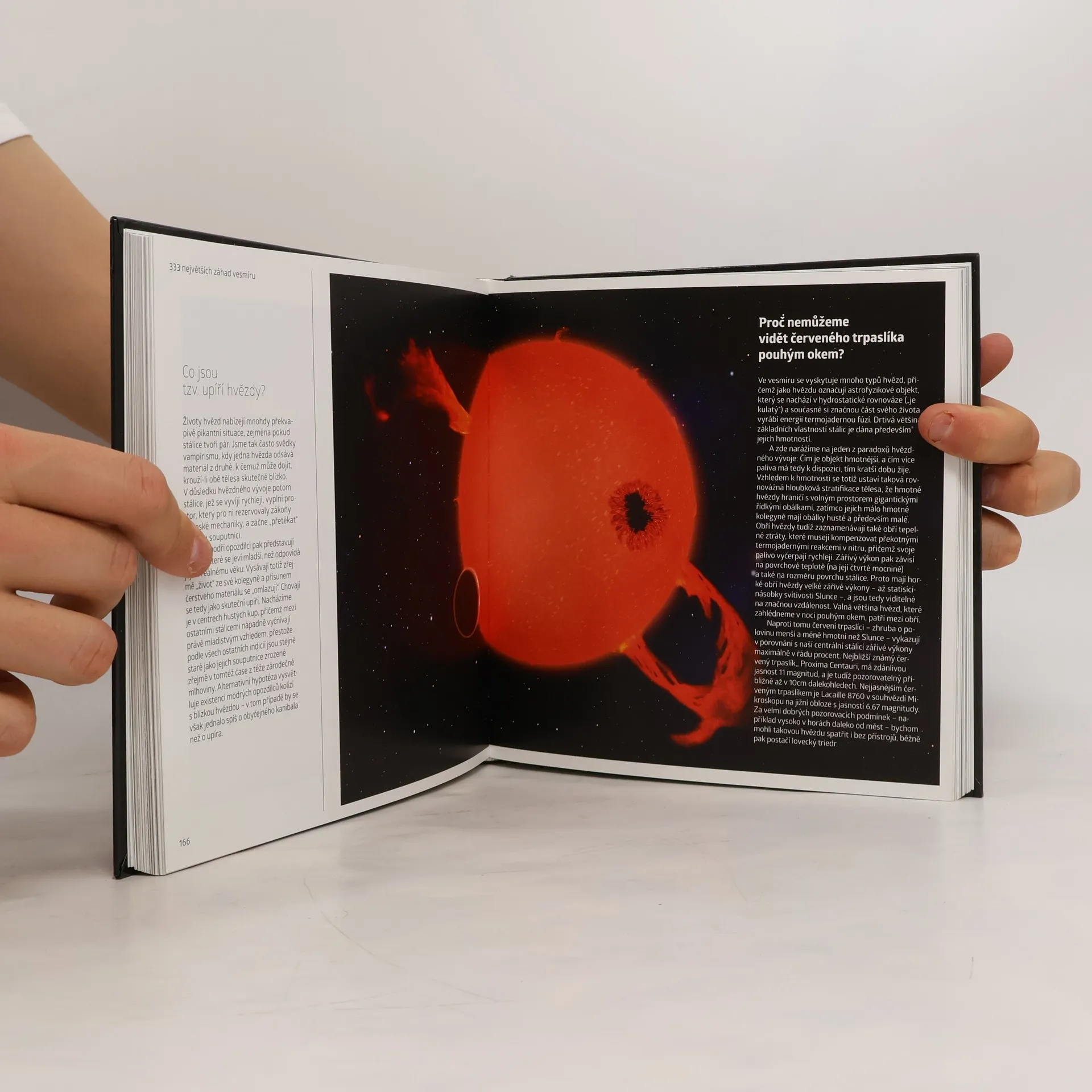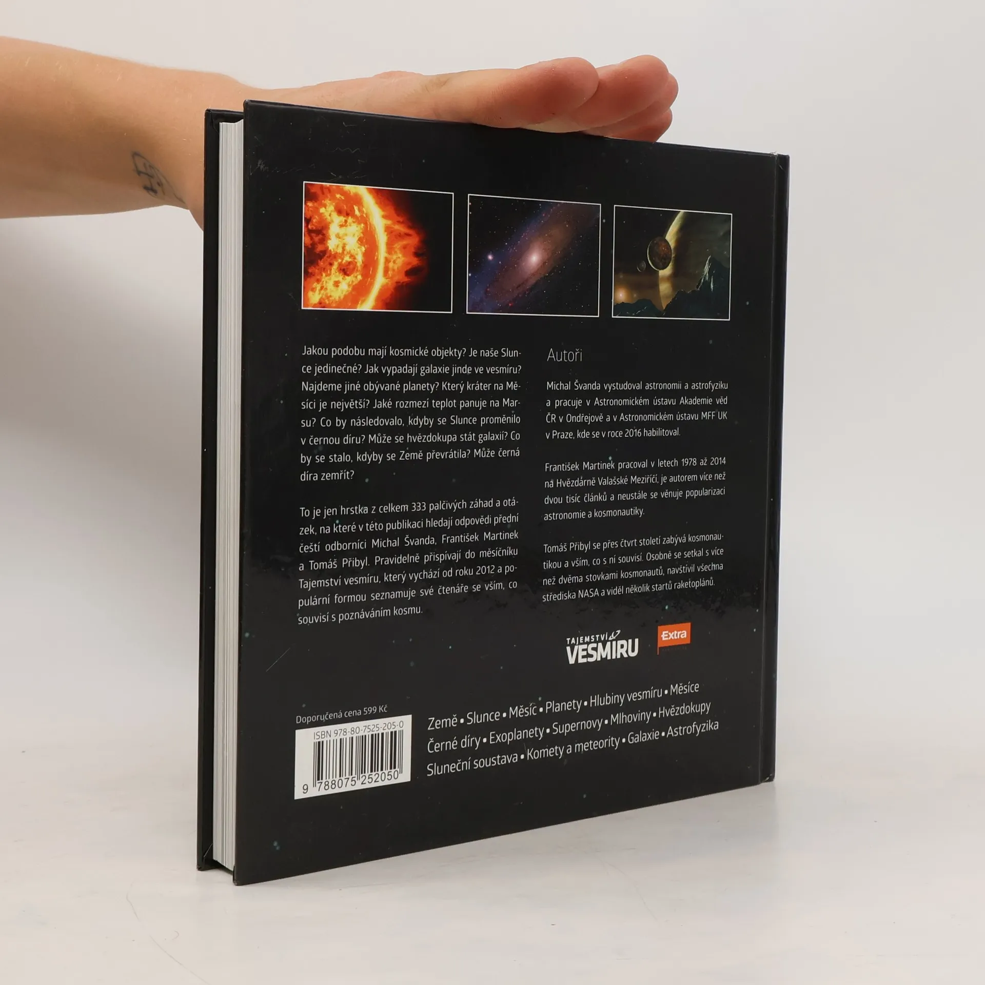 Země * Slunce * Měsíc * Planety * Hlubiny vesmíru * Měsíce * Černé díry * Exoplanety * Supernovy * Mlhoviny * Hvězdokupy * Sluneční soustava * Komety a meteority * Galaxie * Astrofyzika Jak vypadají kosmické objekty? Je naše Slunce jedinečné? Jakou podobu mají galaxie jinde ve vesmíru? Najdeme jiné obývané planety? Který kráter na Měsíci je největší? Jaké rozmezí teplot panuje na Marsu? Co by následovalo, kdyby se Slunce proměnilo v černou díru? Může se hvězdokupa stát galaxií? Co by se stalo, kdyby se Země převrátila? Může černá díra zemřít? To je jen hrstka z celkem 333 palčivých záhad a otázek, na které v této publikaci hledají odpovědi přední čeští odborníci Michal Švanda, František Martinek a Tomáš Přibyl. Pravidelně přispívají do měsíčníku Tajemství vesmíru, který vychází od roku 2012 a populární formou seznamuje své čtenáře se vším, co souvisí s poznáváním kosmu.