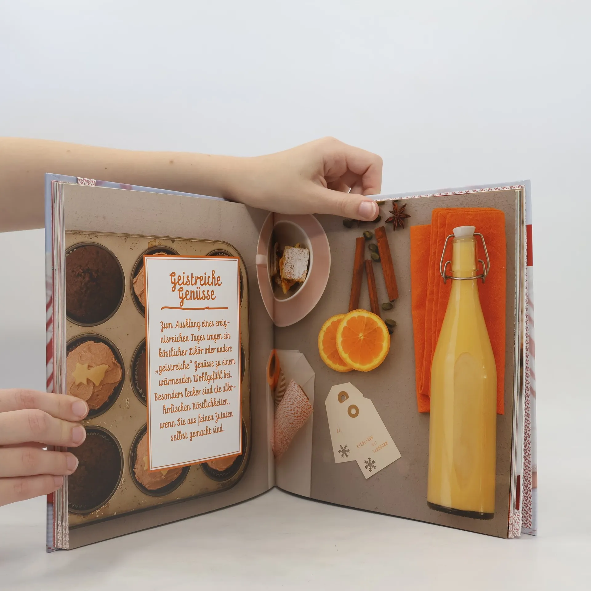 Rezepte für selbst gemachte Geschenke - in 1. Linie Gebackenes, Weihnachtsplätzchen, Kuchen, aber auch Liköre, Gelees. Passend zum Rezept wird anschliessend ein Vorschlag zum Verpacken geboten, der nachgebastelt werden kann.