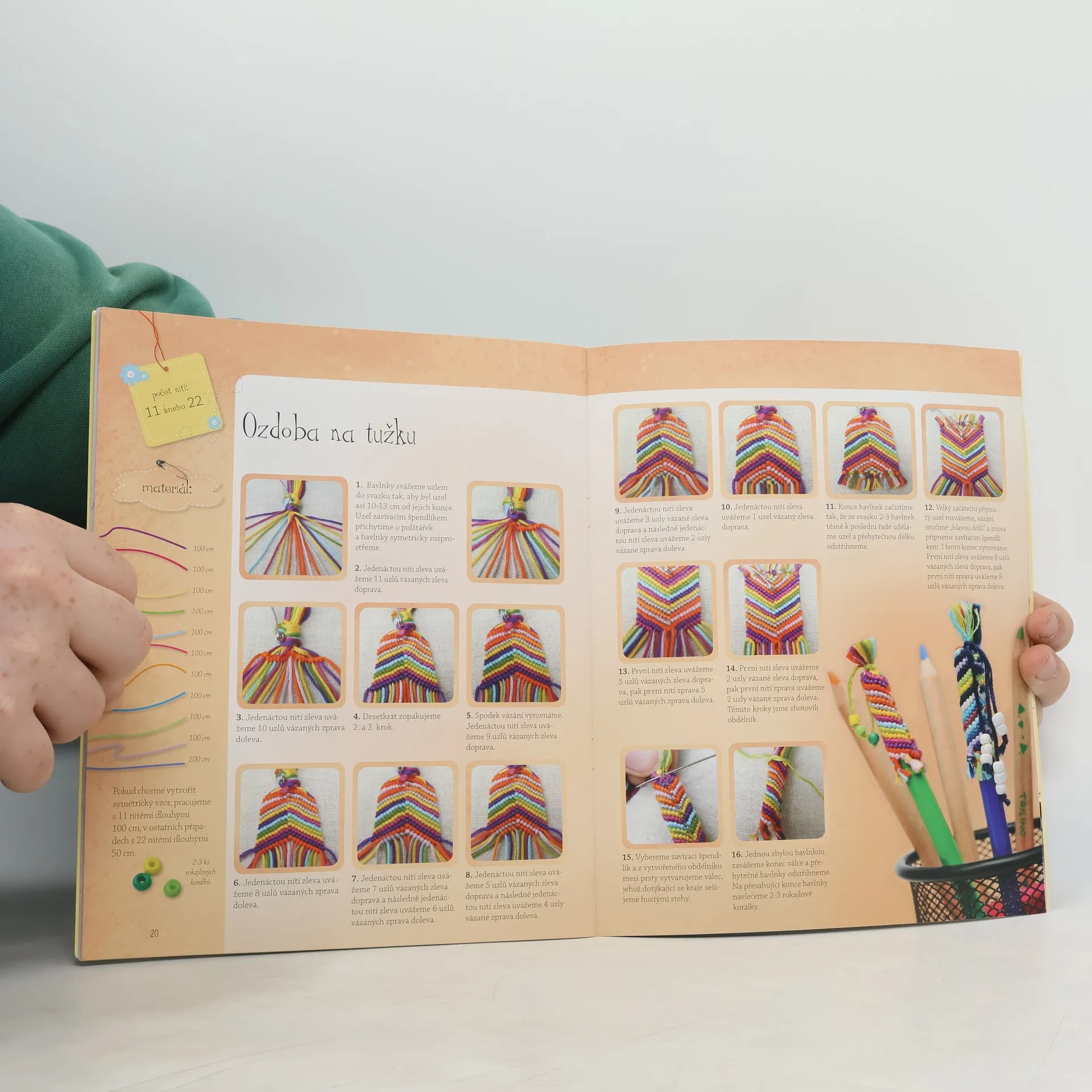 Vázání uzlů je stará řemeslná technika, která se opětovně těší velké oblibě nejen mezi dětmi, ale také dospělými. Použitím pouhých několika bavlnek anebo šňůrek už za několik hodin dokážete vykouzlit barevné a veselé doplňky. Náramky vázané z uzlů můžete nosit a darovat třeba jako symbol přátelství. Pomocí detailních popisů a fotopostupů si tuto jednoduchou techniku snadno osvojíte. Kromě vzorů náramků v sešitu najdete také postup na zhotovení dalších doplňků, jako jsou klíčenky, přívěsky na mobilní telefony, náušnice anebo ozdoby na tužky, takže tato sbírka bude užitečná i pro ty, kteří už tajemství techniky vázání důvěrně znají. Všem přeji příjemné chvíle strávené při kreativním vázání uzlů!