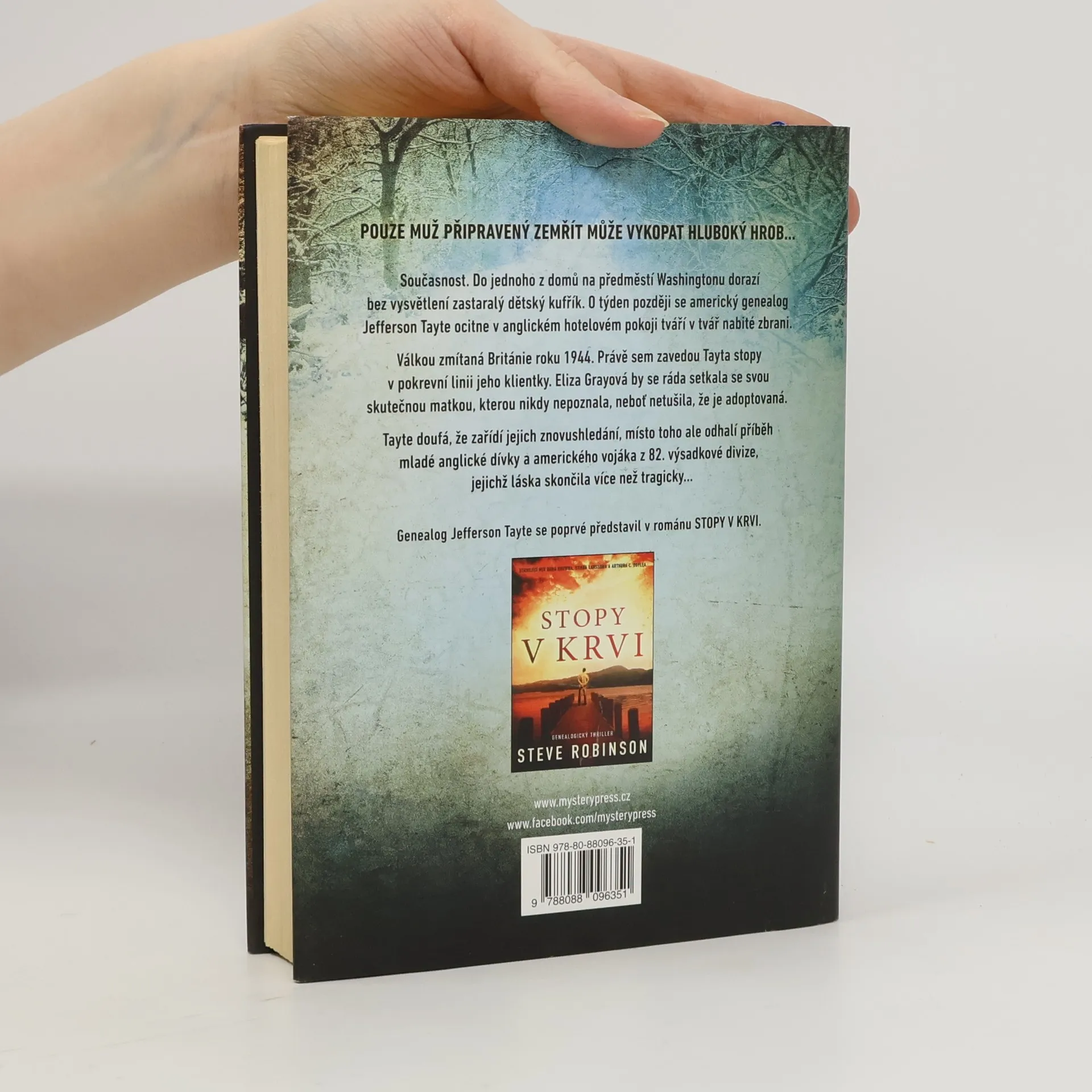 POUZE MUŽ PŘIPRAVENÝ ZEMŘÍT MŮŽE VYKOPAT HLUBOKÝ HROB… Současnost. Do jednoho z domů na předměstí Washingtonu dorazí bez vysvětlení zastaralý dětský kufřík. O týden později se americký genealog Jefferson Tayte ocitne v anglickém hotelovém pokoji tváří v tvář nabité zbrani. Válkou zmítaná Británie roku 1944. Právě sem zavedou Tayta stopy v pokrevní linii jeho klientky. Eliza Grayová by se ráda setkala se svou skutečnou matkou, kterou nikdy nepoznala, neboť netušila, že je adoptovaná. Tayte doufá, že zařídí jejich znovushledání, místo toho ale odhalí příběh mladé anglické dívky a amerického vojáka z 82. výsadkové divize, jejichž láska skončila více než tragicky…