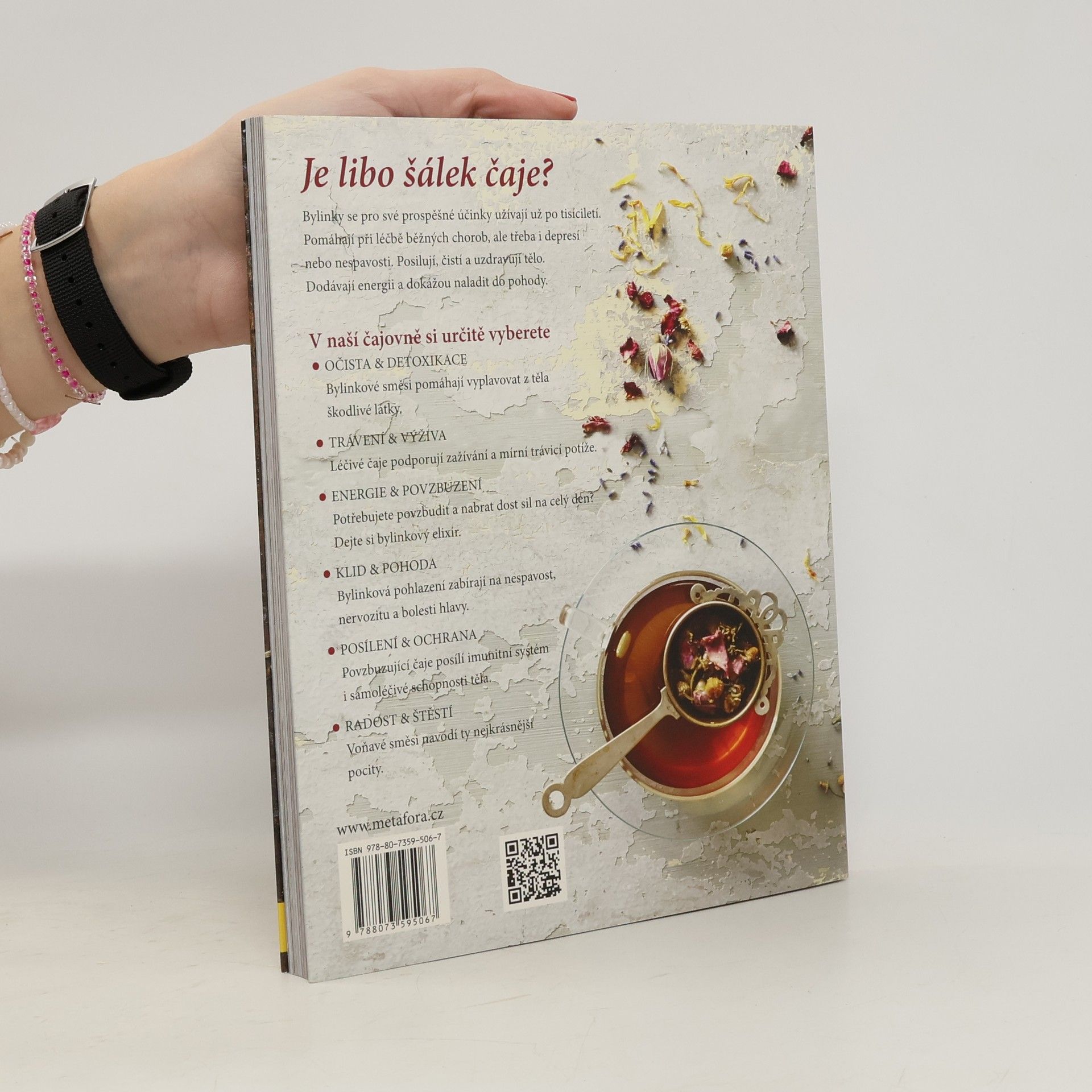V téhle „čajové krabičce“, sbírce dokonale sestavených receptů najdete bylinkové čaje na všechny možné neduhy těla i ducha. Čekají vás tu čaje proti nachlazení, na dobré spaní a správné trávení, na zahřátí v zimě i ochlazení v létě, elixír pro odvahu či energii, stejně jako odvar pro uklidnění a relaxaci. A to samozřejmě zdaleka není všechno. Potřebujete posílit imunitu? Žádný problém. Máme pro vás čaj plný antioxidantů a dalších prospěšných látek, který pomůže zvýšit odolnost proti nemocem. A co takhle čaj pro štěstí? Taky máme. Posaďte se s voňavým šálkem do pohodlného křesla a uvidíte, jak vám vyloudí úsměv na tváři. Chcete ráno plni energie vyskočit z postele? Tak to si nalistujte a uvařte čaj na dobré ráno. Všechno vám půjde pěkně od ruky. Nakonec kniha nabídne ještě přehledný Herbář se všemi bylinkami, které jsou ve všech receptech použité. Dozvíte se o jejich vlastnostech a účincích, takže vždycky budete vědět, na jaké problémy se která hodí a naučíte se míchat své vlastní směsi přímo na míru.