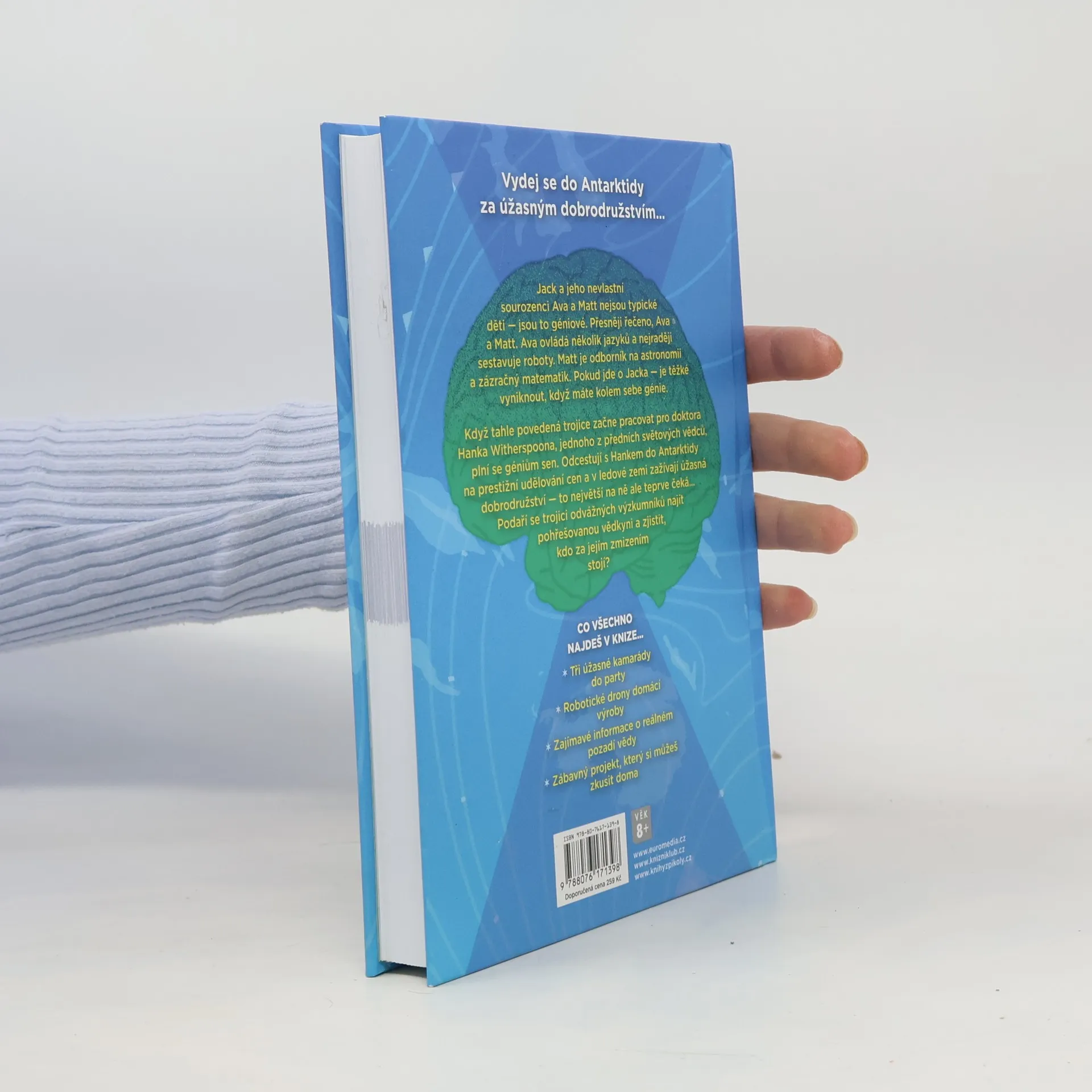 Vydej se do Antarktidy za vědci a úžasným dobrodružstvím… Jack a jeho nevlastní sourozenci Ava a Matt nejsou typické děti – jsou to géniové. Přesněji řečeno, Ava a Matt. Ava ovládá několik jazyků a pro zábavu si staví roboty. Matt je odborník na astronomii a zázračný matematik. Pokud jde o Jacka, je těžké vyniknout, když máte kolem sebe stále génie. Když Ava, Matt a Jack začnou pracovat pro doktora Hanka Witherspoona, jednoho z předních světových vědců, plní se jim sen. Odcestují s Hankem do Antarktidy na prestižní udělování cen. Na Antarktidě zažívají úžasná dobrodružství – to největší na ně ale čeká… Podaří se trojici odvážných výzkumníků najít pohřešovanou vědkyni a zjistit, kdo za jejím zmizením stojí? Pekelně dobrodružná a zábavná série je určena čtenářům od 8 let