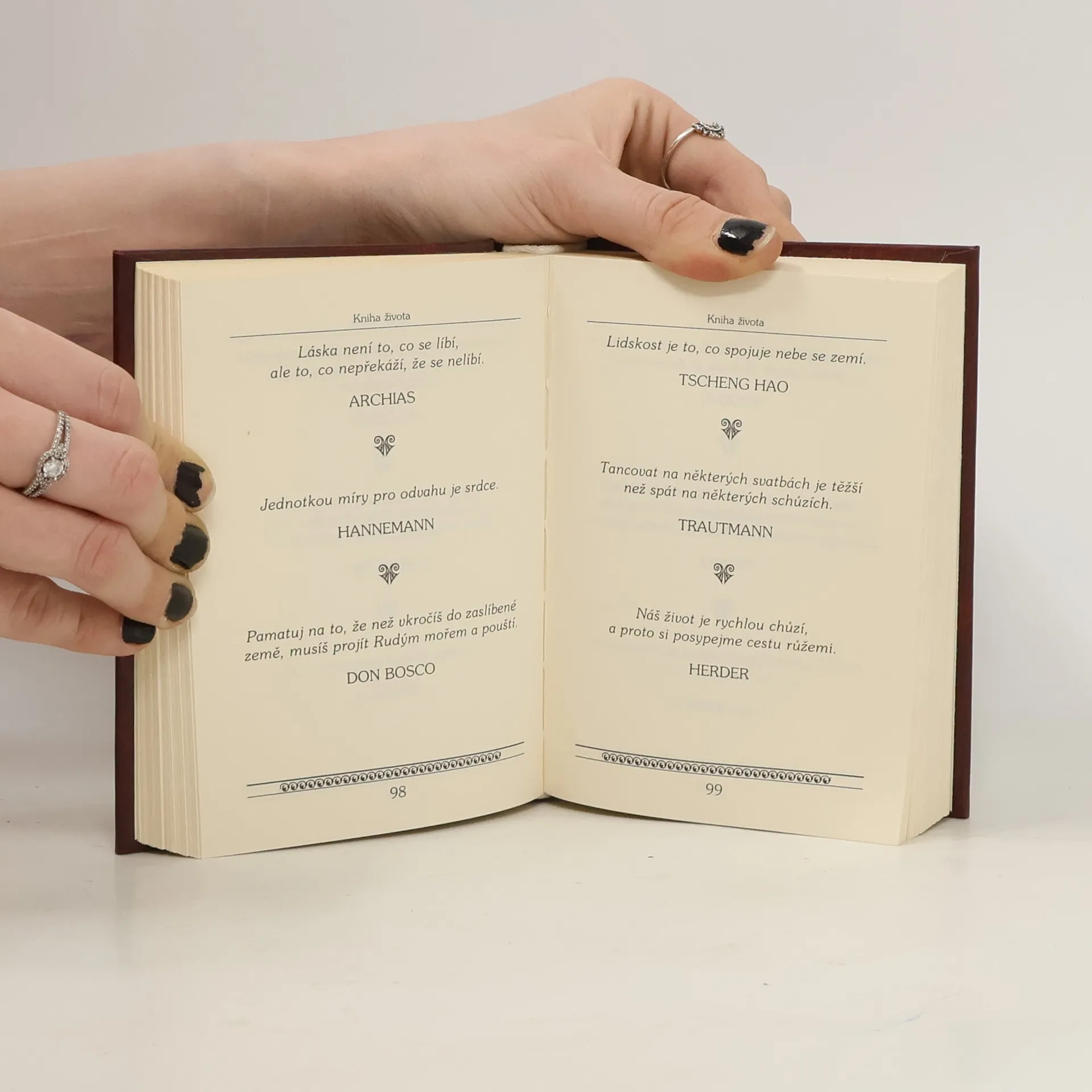 Citáty známých osobností a několik cizích přísloví. Mezi jinými Balzaca, Marie von Ebner-Eschenbachové, Goetha, Heineho, Hofmannstahla, Lichtenberga, La Rochefoucalda, Stanislava Jerzy Lece, Wofganga Mockera, Waggerla, Oscara Wildea a celé řady dalších slavných osobností. Vybrala a sestavila Žofia Lenčová.