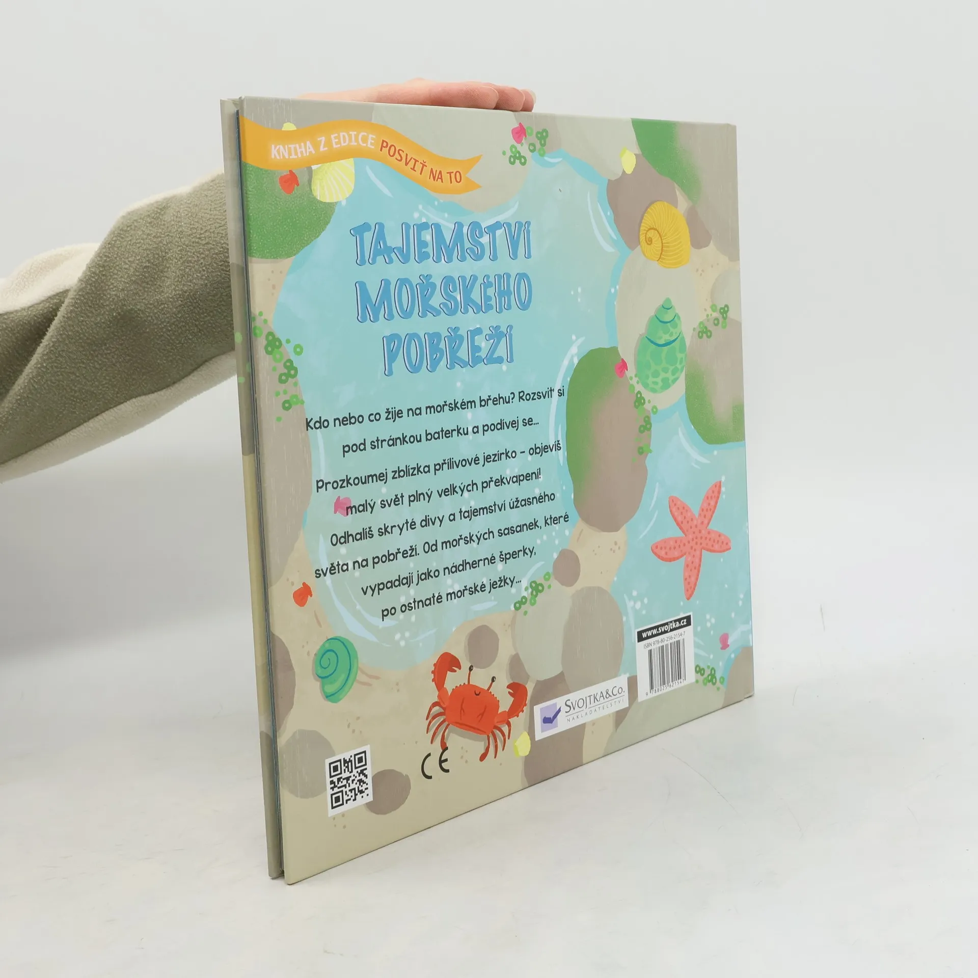 Přidrž si stránky knihy proti světlu nebo je prosviť baterkou… nahlédneš přímo dovnitř přílivového jezírka! Posviť si na to, co se odehrává u mořského břehu. Kdo nebo co žije na mořském břehu? Rozsviť si pod stránkou baterku a podívej se… Prozkoumej zblízka přílivové jezírko – objevíš malý svět plný velkých překvapení! Odhalíš skryté divy a tajemství úžasného světa na pobřeží. Od mořských sasanek, které vypadají jako nádherné šperky, po ostnaté mořské ježky… Objev skryté zázraky mořského břehu. Připrav si svítilnu a vydej se objevovat skrytý svět plný velkých překvapení. Ideální čtení pod peřinu!