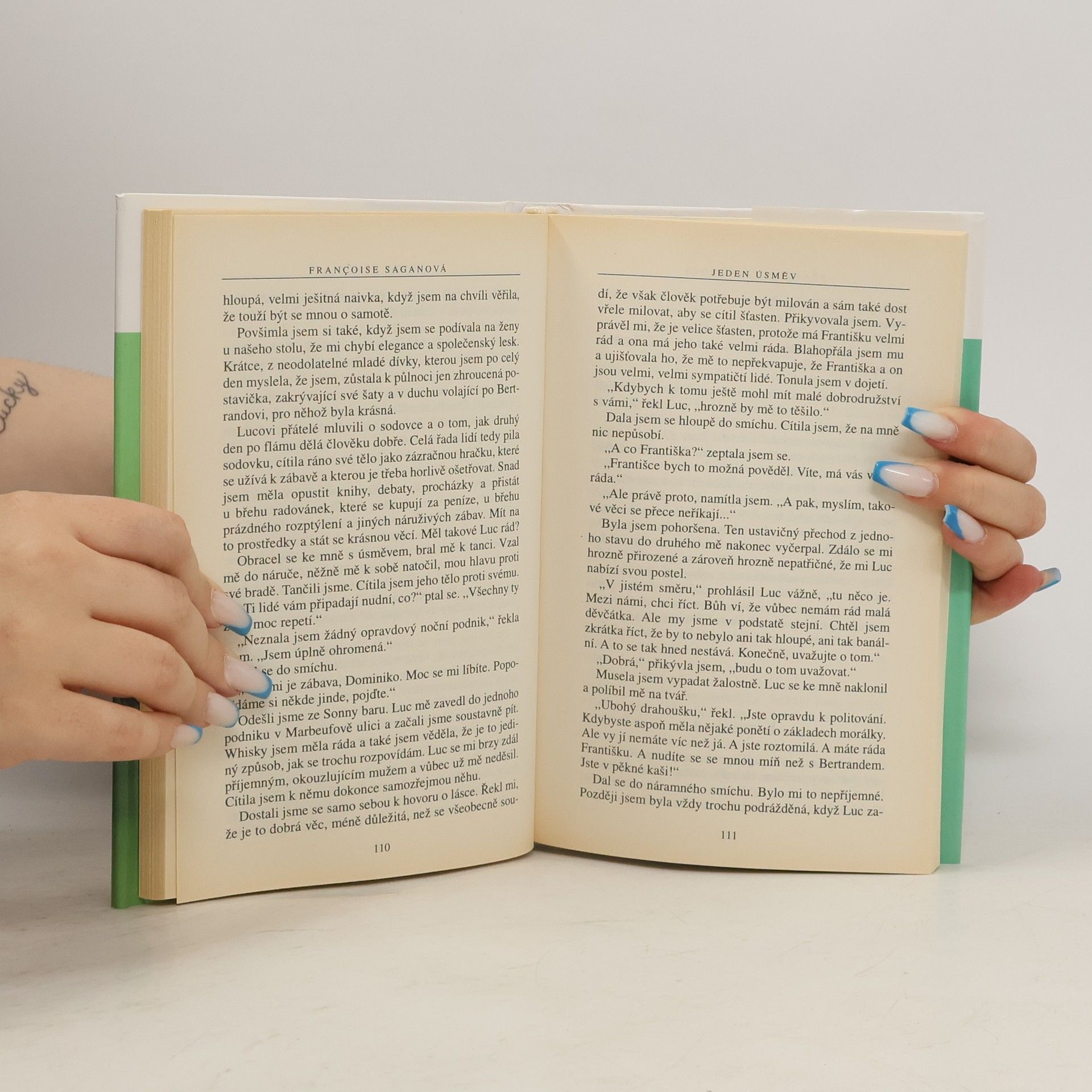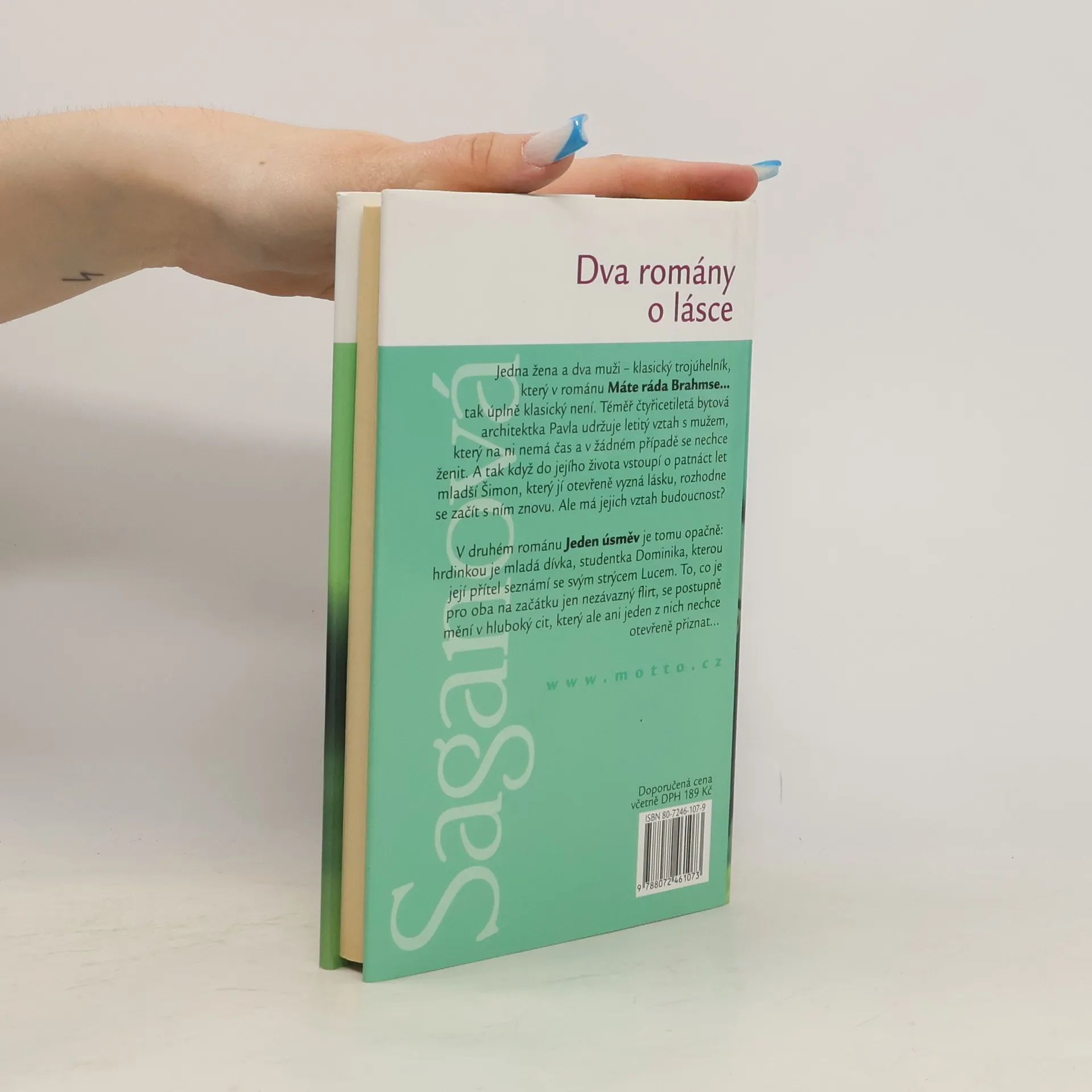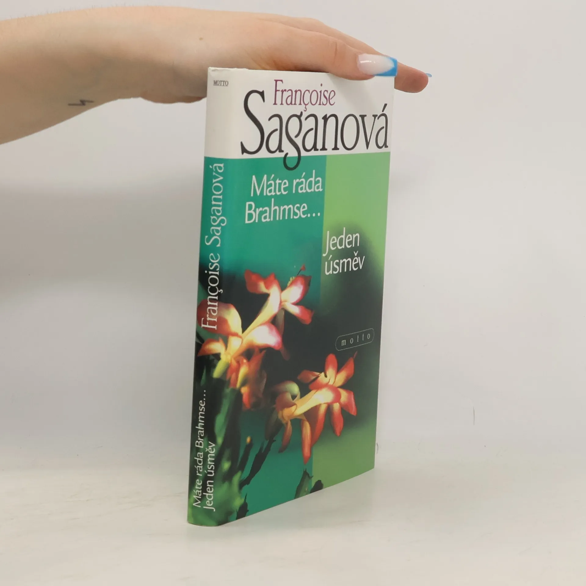 Dvě slavné románové novely populární francouzské spisovatelky jsou věnovány citovým a milostným problémům věkově nesourodých dvojic. — První kniha (Máte ráda Brahmse, 1959) je milostným příběhem stárnoucí ženy a jejích bezvýchodných milostných vztahů, druhá (Jeden úsměv, 1956) naopak líčí milostné vzplanutí mladičké studentky k mnohem staršímu ženatému muži, které začalo jako bezvýznamný flirt a končí citovým obrozením děvčete. Obě knihy pečlivě zaznamenávají všechny nuance vývoje milostného vztahu, zachycují jejich vnitřní atmosféru a v neposlední řadě jsou i psychologickou studií mladé francouzské inteligence na konci 50. a počátku 60. let 20. století.