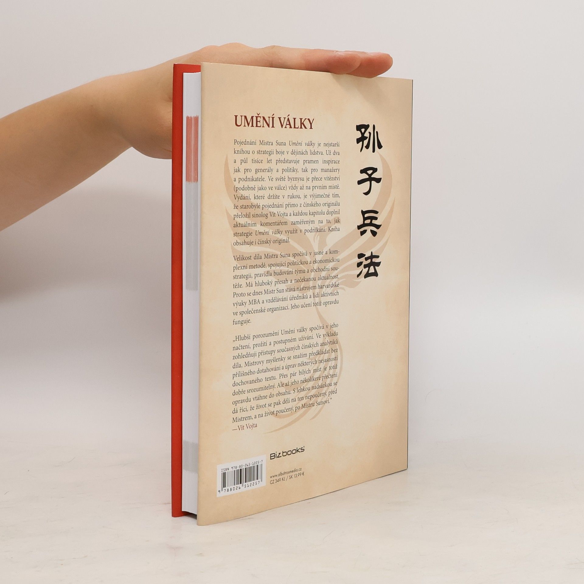 Pojednání Mistra Suna Umění války je nejstarší knihou o strategii boje v dějinách lidstva. Už dva a půl tisíce let představuje pramen inspirace jak pro generály a politiky, tak pro manažery a podnikatele. Ve světě byznysu je přece vítězství (podobně jako ve válce) vždy až na prvním místě. Vydání, které držíte v rukou, je výjimečné tím, že starobylé pojednání přímo z čínského originálu přeložil sinolog Vít Vojta a každou kapitolu doplnil aktuálním komentářem zaměřeným na to, jak strategie Umění války využít v podnikání. Kniha obsahuje i čínský originál. Velikost díla Mistra Suna spočívá v jasné a komplexní metodě, spojující politickou a ekonomickou strategii, pravidla budování týmu a obchodní soutěže. Má hluboký přesah a nečekanou aktuálnost. Proto se dnes Mistr Sun stává nástrojem harvardské výuky MBA a vzdělávání úředníků a lidí aktivních ve společenské organizaci. Jeho učení totiž opravdu funguje.