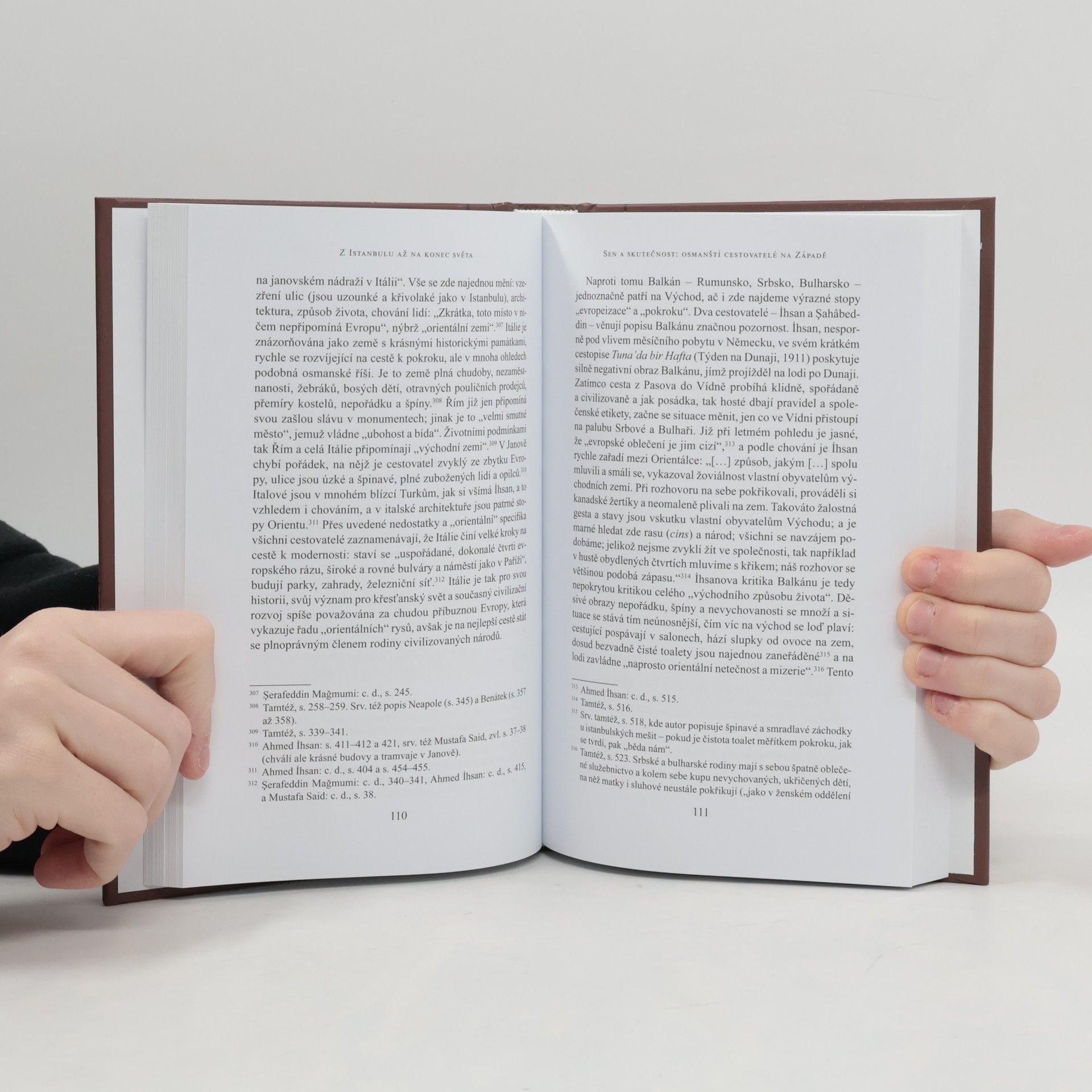 Kniha sleduje cesty vzdělaných Osmanů, kteří se vydávali dvěma směry – na Západ, do Evropy, a na Východ, do arabských provincií říše. Cestopisné zprávy z tohoto období jsou mimořádně zajímavé vzhledem ke zvláštnímu postavení osmanské říše a Turků na pomezí dvou civilizačních okruhů. Turecko sice bylo v souvislosti s procesem modernizace i s imperiálními ambicemi západních mocností na Evropě závislé materiálně i ideově a představitelé tureckých elit byli Západem ovlivňováni, zároveň ovšem zaujímali dominantní postavení ve vztahu k zaostalejším jihovýchodním oblastem říše. Kniha ukazuje obraz Evropy a východních provincií osmanské říše v tureckých cestopisech a zkoumá, jakým způsobem setkávání s novým prostředím autory ovlivňovalo v jejich chápání vlastní identity, a to v období, které bylo pro utváření moderní turecké společnosti a jejího vztahu k Evropě klíčové.