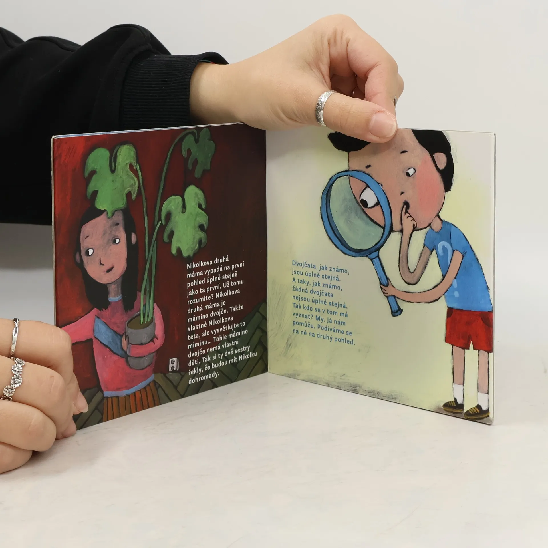 Chlapeček Nikolka má „dvě mámy“: jedná se vlastně o maminku a o Nikolkovu tetu, maminčino dvojče. Jemným způsobem děti učí tomu, že každá rodina je jedinečná a někdy je dobré se zastavit a té svojí se podívat do očí. Výtvarnou knížku Báry Valecké provází text Radka Malého, křehký a zároveň silný.