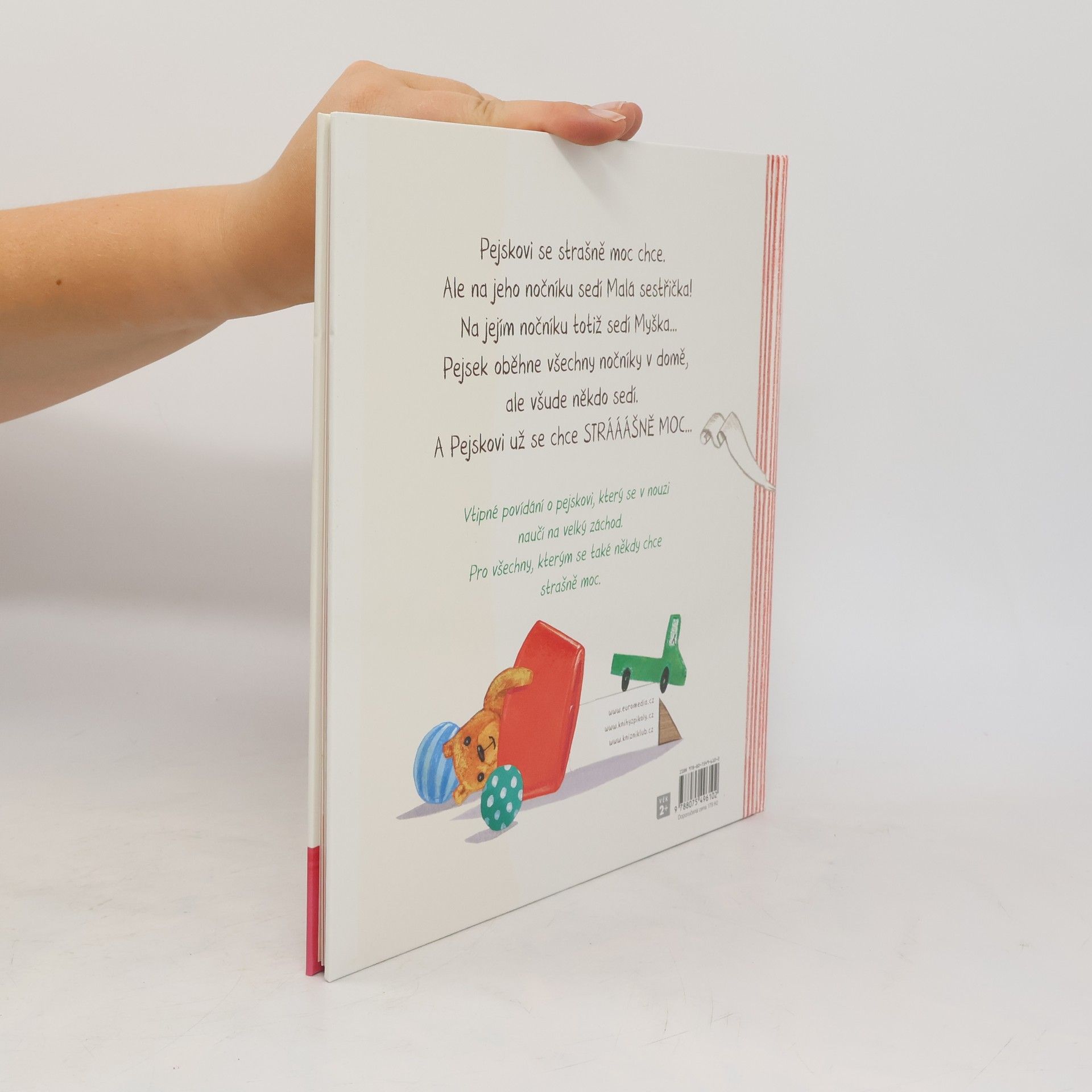 Pejskovi se strašně moc chce, ale na nočníku sedí jeho sestřička. Na jejím nočníku totiž sedí myška… Pejsek oběhne všechny nočníky v domě, ale všude někdo sedí! A Pejskovi už se chce STRÁÁÁŠNĚ MOC… Vtipné povídání o pejskovi, který se v nouzi naučí na velký záchod. Kniha pro všechny děti, kterým se také někdy chce strašně moc.