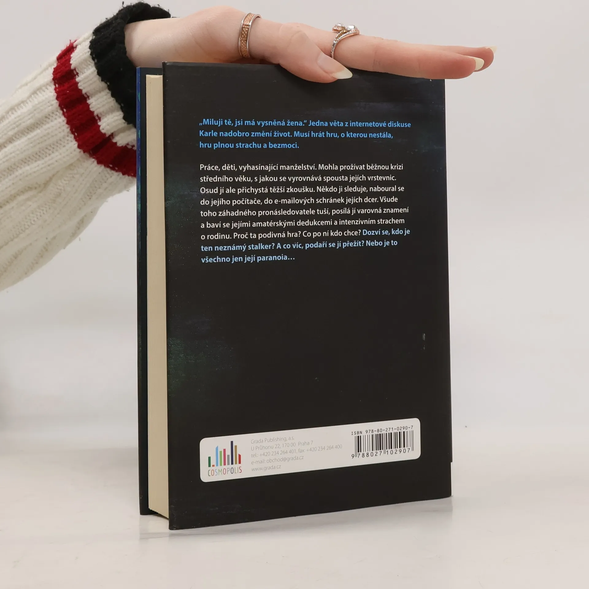 Jediná věta promění Karle život v peklo. Mohla prožívat běžnou krizi středního věku, s jakou se vyrovnává spousta jejích vrstevnic. Osud jí ale přichystá zkoušku těžšího kalibru. Někdo ji sleduje, naboural se do jejího počítače, do e-mailových schránek jejích dcer. Všude toho neznámého pronásledovatele tuší, posílá jí varovná znamení a baví se jejími amatérskými dedukcemi a intenzivním strachem o rodinu. Proč ta podivná hra? Co po ní kdo chce? Karla se snaží se najít jakoukoliv stopu, která by jí pomohla všechno pochopit, ale nemá žádnou podporu v okolí. Cítí se jako štvaná zvěř. Je kořistí opravdového útočníka, nebo své vlastní fantazie? Proč se ve všem dá najít skrytý význam? Možná je opravdu blázen, jak si myslí její muž. Hraje hru, o kterou nestála, hru plnou strachu a bezmoci.