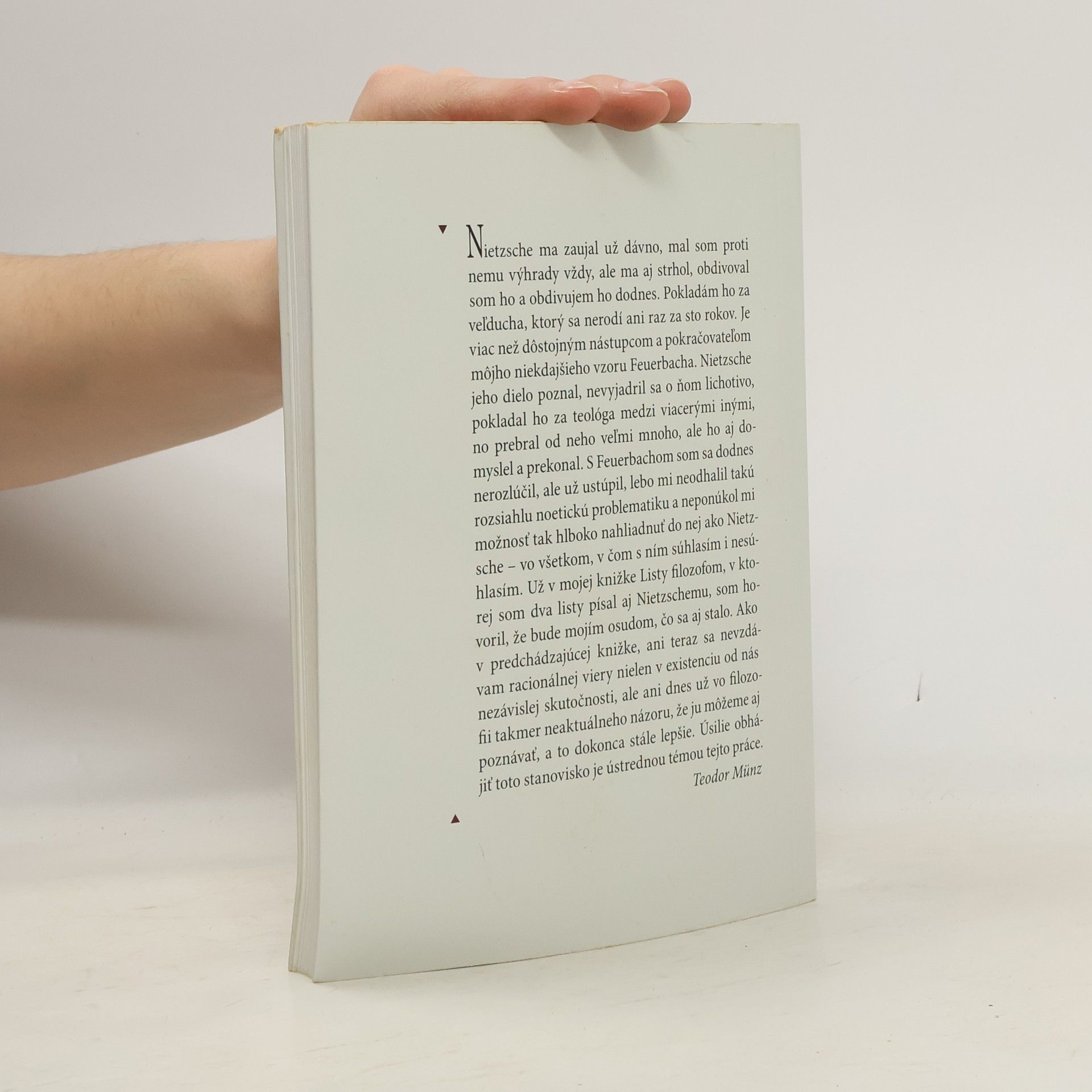 Nietzsche ma zaujal už dávno, mal som proti nemu výhrady vždy, ale ma aj strhol, obdivoval som ho a obdivujem ho dodnes. Pokladám ho za veľducha, ktorý sa nerodí ani raz za sto rokov. Je viac než dôstojným nástupcom a pokračovateľom môjho niekdajšieho vzoru Feuerbacha. Nietzsche jeho dielo poznal, nevyjadril sa o ňom lichotivo, pokladal ho za teológa medzi viacerými inými, no prebral od neho veľmi mnoho, ale ho aj domyslel a prekonal. S Feuerbachom som sa dodnes nerozlúčil, ale už ustúpil, lebo mi neodhalil takú rozsiahlu noetickú problematiku a neponúkol mi možnosť tak hlboko nahliadnuť do nej ako Nietzsche – vo všetkom, v čom s ním súhlasím i nesúhlasím. Už v mojej knižke Listy filozofom, v ktorej som dva listy písal aj Nietzschemu, som hovoril, že bude mojím osudom, čo sa aj stalo. Ako v predchádzajúcej knižke, ani teraz sa nevzdávam racionálnej viery nielen v existenciu od nás nezávislej skutočnosti, ale ani dnes už vo filozofii takmer neaktuálneho názoru, že ju môžeme aj poznávať, a to dokonca stále lepšie. Úsilie obhájiť toto stanovisko je ústrednou témou tejto práce.