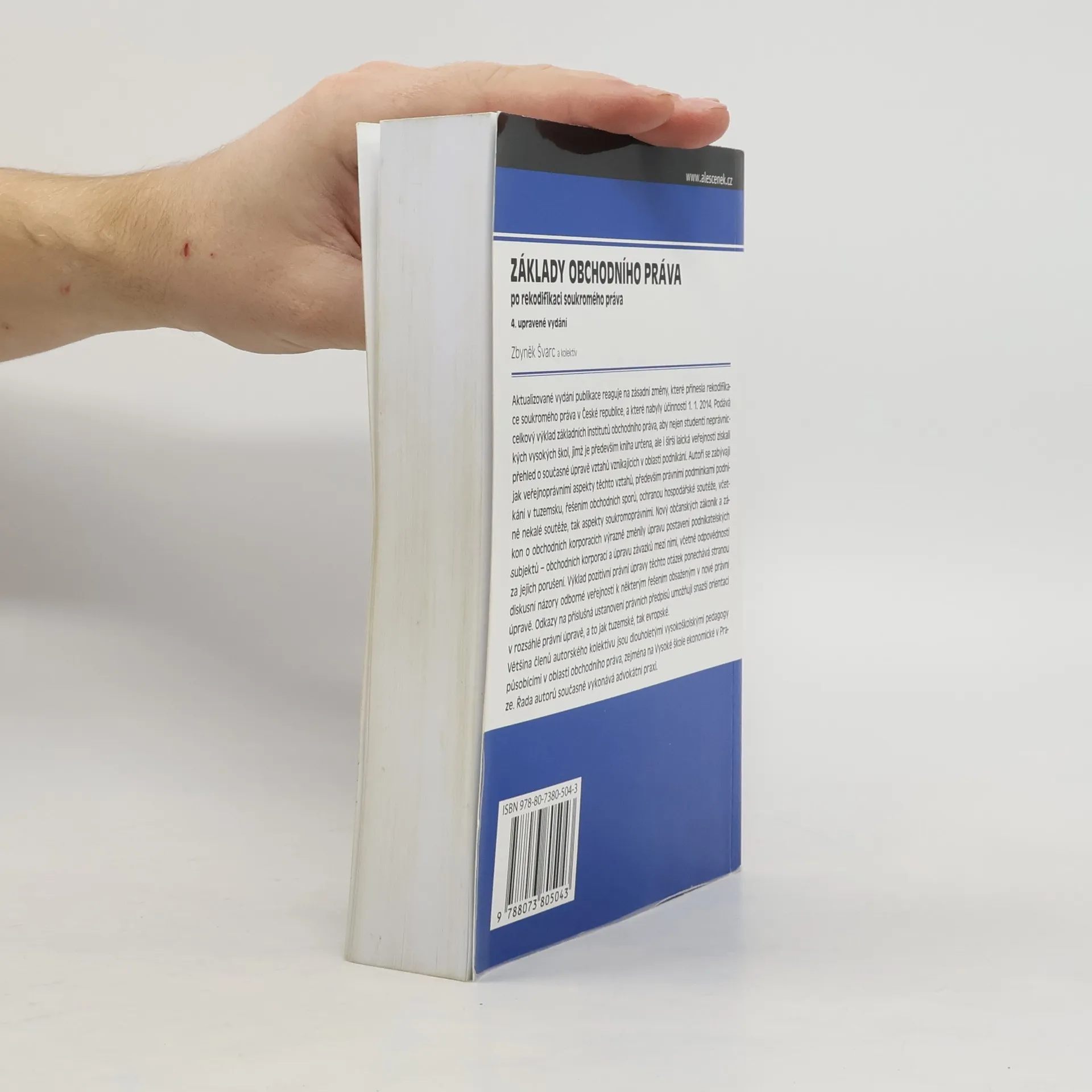 Aktualizované vydání publikace reaguje na zásadní změny, které přinesla rekodifikace soukromého práva v České republice, a které nabyly účinnosti 1. 1. 2014. Podává celkový výklad základních institutů obchodního práva, aby nejen studenti neprávnických vysokých škol, jimž je především kniha určena, ale i širší laická veřejnosti získali přehled o současné úpravě vztahů vznikajících v oblasti podnikání. Autoři se zabývají jak veřejnoprávními aspekty těchto vztahů, především právními podmínkami podnikání v tuzemsku, řešením obchodních sporů, ochranou hospodářské soutěže, včetně nekalé soutěže, tak aspekty soukromoprávními. Nový občanských zákoník a zákon o obchodních korporacích výrazně změnily úpravu postavení podnikatelských subjektů – obchodních korporací a úpravu závazků mezi nimi, včetně odpovědnosti za jejich porušení. Výklad pozitivní právní úpravy těchto otázek ponechává stranou diskusní názory odborné veřejnosti k některým řešením obsaženým v nové právní úpravě. Odkazy na příslušná ustanovení právních předpisů umožňují snazší orientaci v rozsáhlé právní úpravě, a to jak tuzemské, tak evropské. Většina členů autorského kolektivu jsou dlouholetými vysokoškolskými pedagogy působícími v oblasti obchodního práva, zejména na Vysoké škole ekonomické v Praze. Řada autorů současně vykonává advokátní praxi.