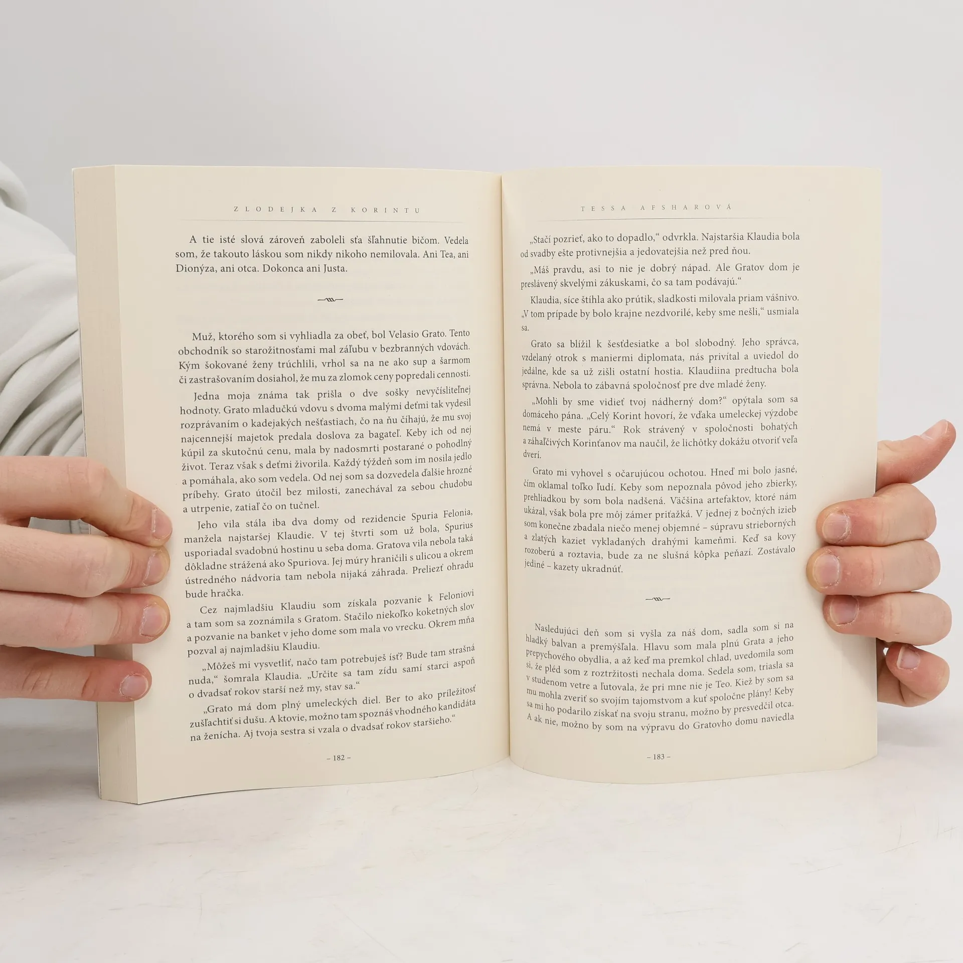 Pútavé rozprávanie v knihe Zlodejka z Korintu je o dobrodružstvách, odvahe a vykúpení. Prenesie vás do minulosti a pochopíte, prečo Debbie Macomberová o jeho autorke povedala: „Biblickým príbehom nik nevdýchne život tak ako Tessa Afsharová.“ Je prvé storočie, bohaté a úchvatne krásne mesto Korint prekypuje životom, je však plné nebezpečenstiev a skazenosti. Ariadne po rokoch prežitých u matky v Aténach ujde späť do korintského domu milovaného otca. Zakrátko však odhalí tajomstvo, ktoré zničilo manželstvo jej rodičov. V snahe ochrániť otca je otrasená Ariadne ochotná riskovať všetko – dobrú povesť, slobodu aj lásku milovaného muža – a dáva sa na riskantné chodníčky spolu s otcom. Dobrodružstvo ju vzrušuje, hoci vie, že sa zahráva s ohňom: všetko visí na vlásku, a ak sa tajomstvo dostane do nesprávnych rúk, ju i otca čaká skľučujúca budúcnosť. Keď im potom do života vstúpi židovský rabín Pavol, všetko, čomu Ariadne a jej otec verili, rozmetá svojím radikálnym učením na prach, no zároveň ponúkne niečo, v čo by sa nikdy neodvážili dúfať.