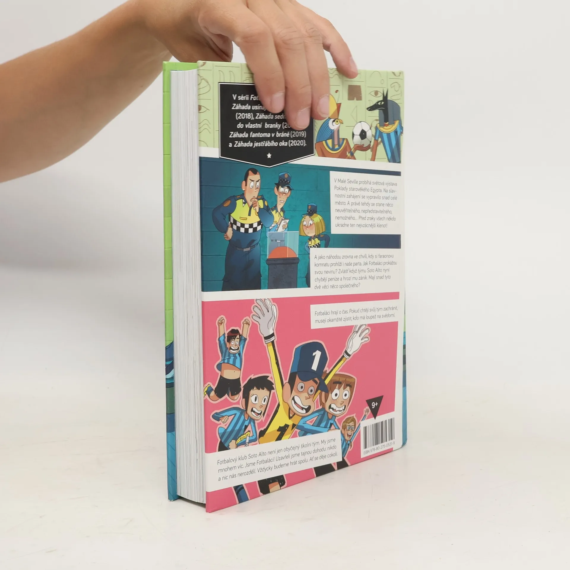 A je tu nový zapeklitý případ pro Fotbaláky! Tentokrát je v sázce osud celého klubu. V Malé Seville se právě koná světová výstava Poklady starověkého Egypta. Na slavnostní zahájení se vypravilo snad celé město. A právě tehdy se stane něco neuvěřitelného, nepředstavitelného, nemožného… Před zraky všech někdo ukradne ten nejvzácnější klenot! A jako náhodou zrovna ve chvíli, kdy si faraonovu komnatu prohlíží i naše parta. Jak Fotbaláci prokážou svou nevinu? Zvlášť když vyjde najevo, že týmu Soto Alto chybějí peníze a hrozí mu zánik. Mají snad tyto dvě věci něco společného? Fotbaláci hrají o čas. Pokud chtějí svůj tým zachránit, musí okamžitě zjistit, kdo má loupež na svědomí. Další díl úspěšné série knih, v nichž se sice hlavně hraje fotbal, ale jde také o vztahy a napínavé detektivní záhady.