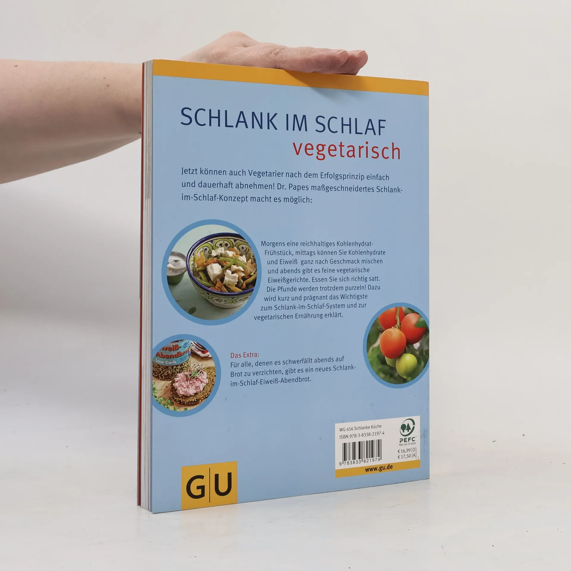 Jetzt können auch Vegetarier nach dem Erfolgsprinzip einfach und dauerhaft abnehmen! Dr. Papes maßgeschneidertes Schlank-im-Schlaf-Konzept macht es möglich. Mit den leckeren vegetarischen Gerichten dürfen Sie schlemmen. Morgens eine reichhaltiges Frühstück, mittags essen Sie nach Lust und Laune und abends feine vegetarische Eiweißgerichte. Essen Sie sich richtig satt. Die Pfunde werden trotzdem purzeln! Und für alle, denen es schwerfällt abends auf Brot zu verzichten, gibt es ein neues Schlank-im-Schlaf-Eiweiß-Brot. Es ist bereits in vielen Bäckereien erhältlich. Oder sie bestellen sich eine Backmischung zum Selberbacken. Auch dazu finden Sie Tipps und Rezepte im Buch. Gut essen und gesund abnehmen - werden auch Sie Schlank im Schlaf.