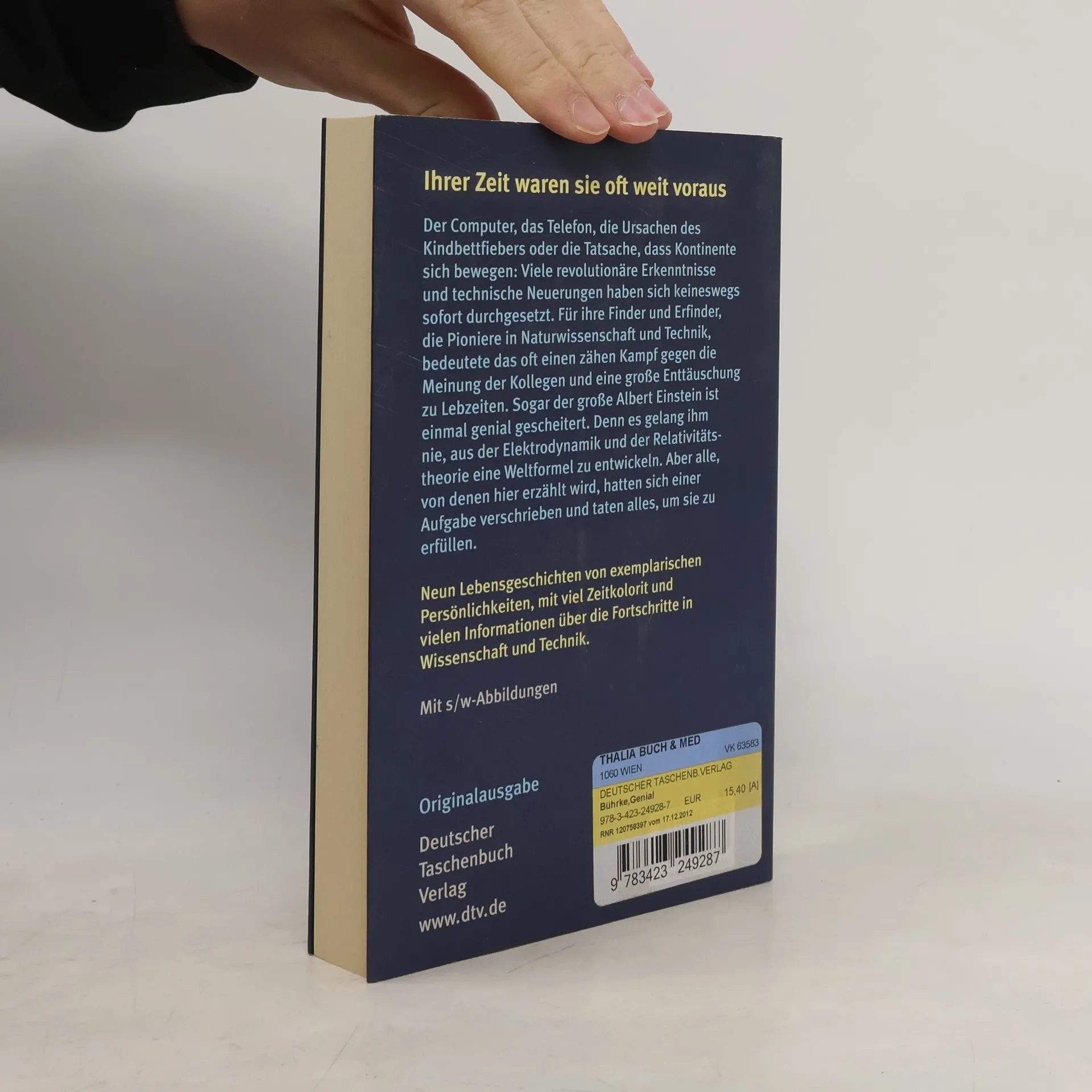 Ihrer Zeit waren sie weit voraus Der Computer, das Telefon, die Ursachen des Kindbettfiebers oder die Tatsache, dass Kontinente sich bewegen: Viele revolutionären Erkenntnisse und technischen Neuerungen haben sich keineswegs sofort durchgesetzt. Für ihre Finder und Erfinder die Pioniere in Naturwissenschaft und Technik, bedeutete das oft einen zähen Kampf gegen die Meinung der Kollegen und eine große Enttäuschung zu Lebzeiten. Sogar der große Albert Einstein ist einmal genial gescheitert. Denn es gelang ihm nie, aus der Elektrodynamik und der Relativitätstheorie eine Weltformel zu entwickeln. Aber alle, von denen hier erzählt wird, hatten sich einer Aufgabe verschrieben und taten alles, um sie zu erfüllen. Neun Lebensgeschichten von exemplarischen Persönlichkeiten, mit viel Zeitkolorit und vielen Informationen über die Fortschritte in Wissenschaft und Technik.