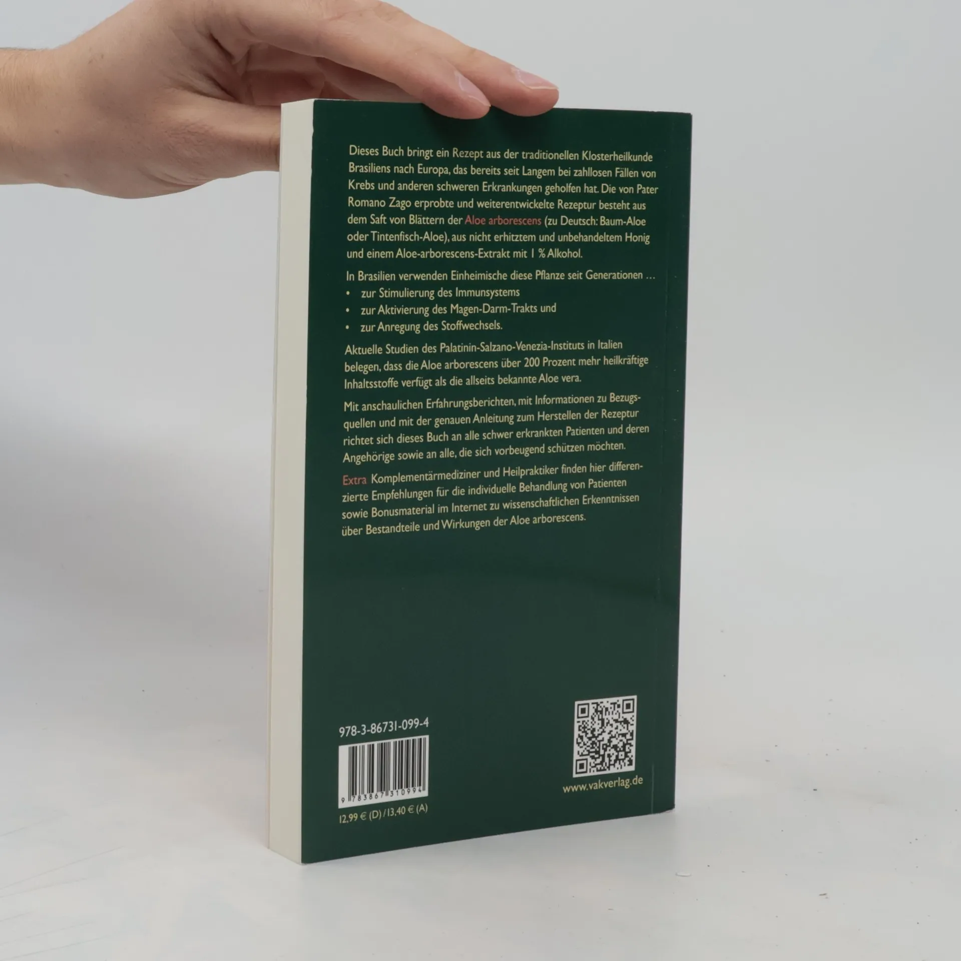 Das Buch bringt ein Rezept aus der traditionellen Klosterheilkunde Brasiliens nach Europa, das bereits seit Langem bei zahllosen Fällen von Krebs und anderen schweren Erkrankungen geholfen hat. Die von Pater Romano Zago erprobte und weiterentwickelte Rezeptur besteht aus dem Saft des ganzen Blattes der Aloe arborescens (zu Deutsch: Baum-Aloe oder Tintenfisch-Aloe), aus nicht erhitztem und unbehandeltem Honig und einem Aloe-arborescens-Extrakt mit 1% Alkohol. In Brasilien verwenden die Einheimischen diese Pflanze seit Generationen zur Stimulierung des Immunsystems, zur Anregung des Magen-Darm-Trakts und des Stoffwechsels. Untersuchungen unabhängiger Labore haben ergeben, dass der in dieser Rezeptur verwendete Saft der Aloe arborescens das gesamte Spektrum an sekundären Pflanzenstoffen, Mono- und Polysacchariden, Mineralstoffen sowie zusätzlichen pflanzlichen Nährstoffen enthält. Aktuelle Studien des Palatinin-Salzano-Venezia-Instituts in Italien belegen, dass die Aloe arborescens sogar über 200 Prozent mehr phytotherapeutische Inhaltsstoffe verfügt als die allseits bekannte Aloe vera. Mit anschaulichen Erfahrungsberichten und der genauen Anleitung zum Herstellen der Rezeptur richtet sich dieses Buch an alle schwer erkrankten Patienten und deren Angehörige sowie an Heilpraktiker und Komplementärmediziner, aber auch an alle, die sich vorbeugend schützen möchten.