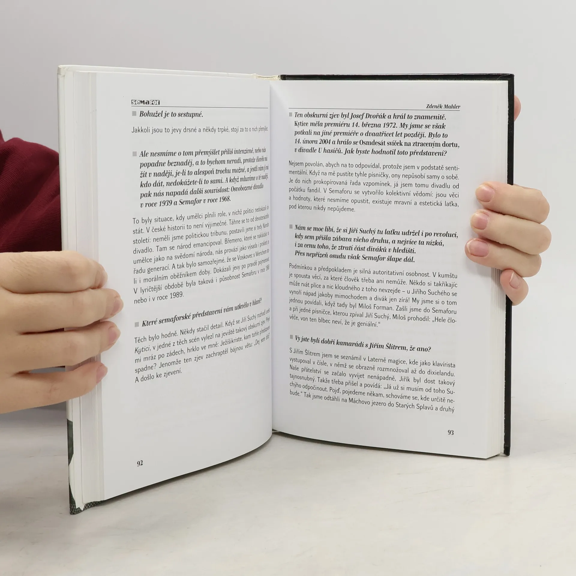 Historie divadla s přehledem herců a zpěváků, kteří v Semaforu vystupovali. Rozhovory na téma Semafor minulosti a současnosti. Autorská dvojice Marie a Tomáš Salabovi v úvodu ke knize rozhovorů přiznávají, že je k jejímu napsání vedla především snaha vzdát hold milovanému divadlu. Aby splnili slib, který si dali, oslovili 22 osobností a shromáždili vzpomínky letmé i podstatnější. Důsledně stranili dvojici Suchý-Šlitr a pominuli další podílníky Semaforu - Grossmanna, Šimka a Josefa Dvořáka. Vznikl tak obraz viděný z jednoho zorného úhlu, což může být kladem i nedostatkem knížky. Rozhovory doplňují černobílé fotografie z archivu oslovených.