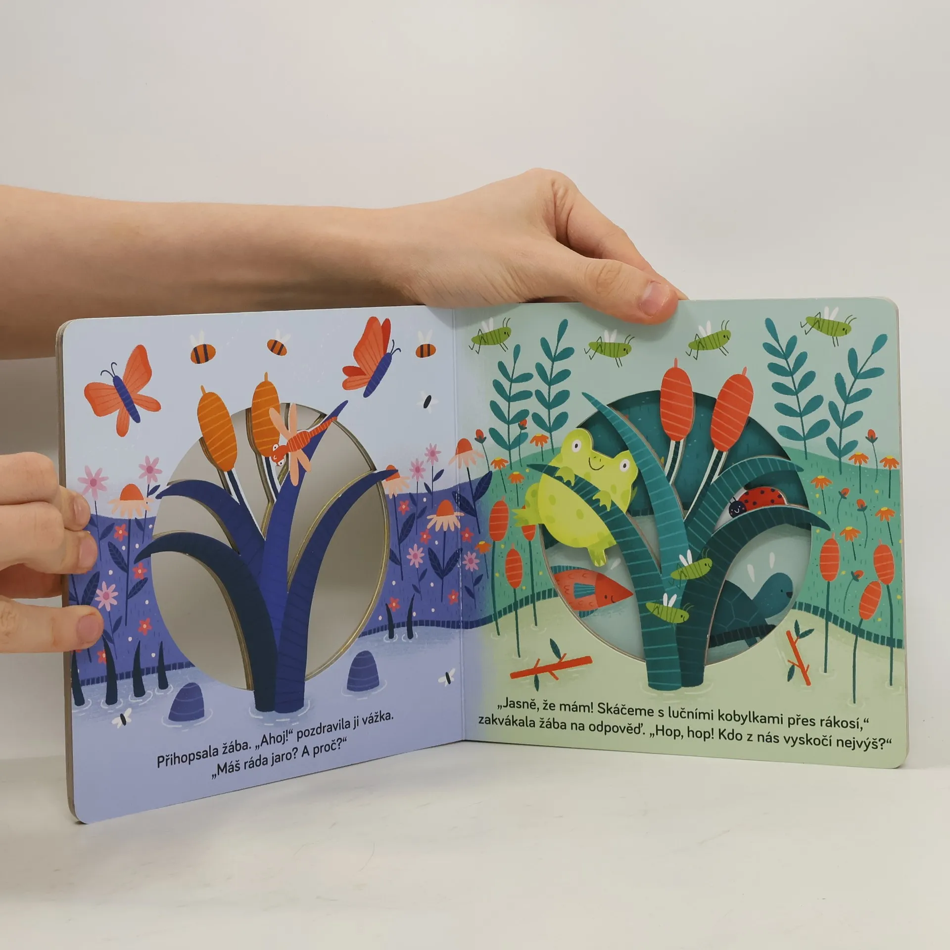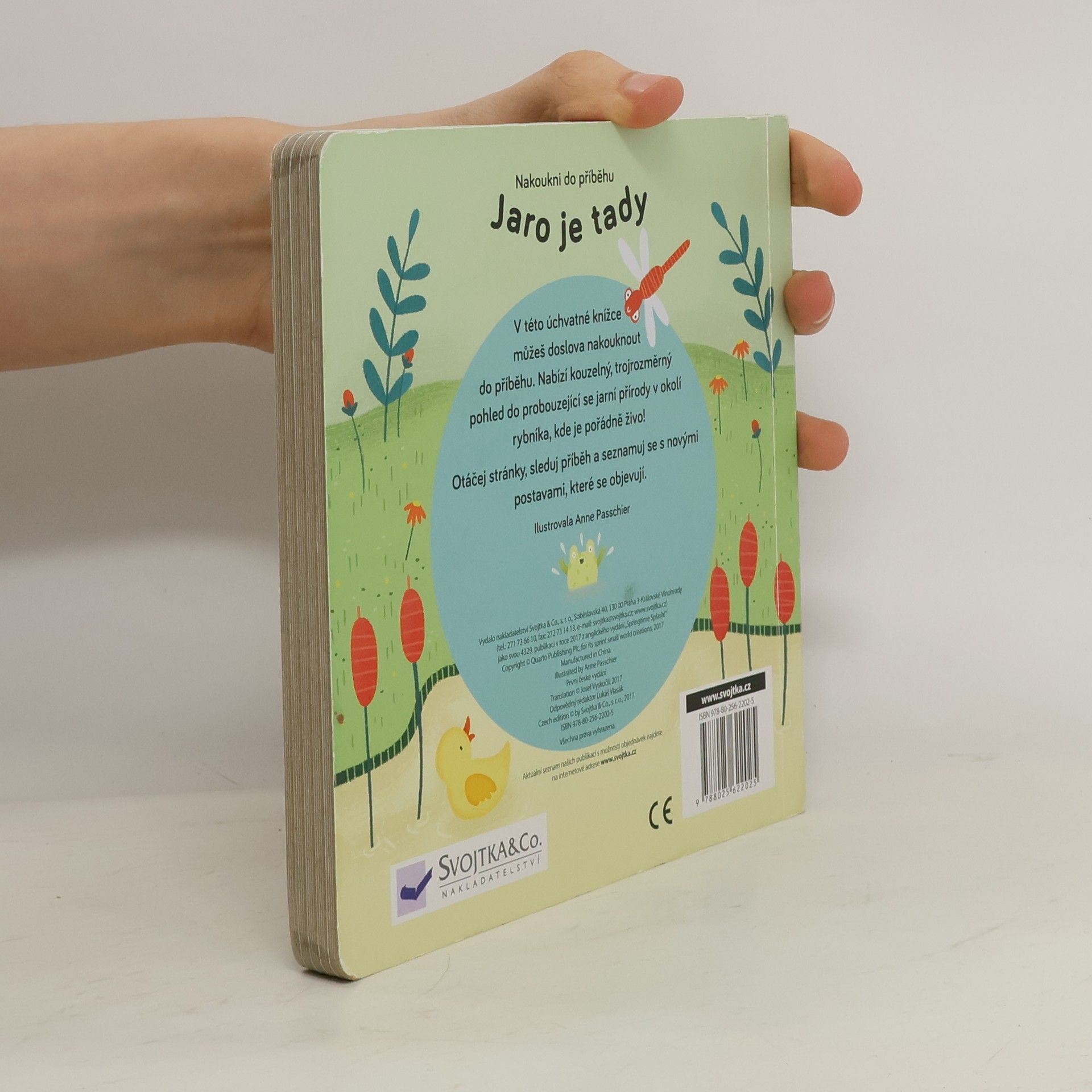 Nastává jaro a pro kachničky u rybníka všechno krásně, lákavě voní. I vážka nad hladinou si užívá hru ve větru a letí se podívat na svou kamarádku žabku. Vedle sedí beruščí maminka, která má plno práce – musí svým dítkům ukázat celý svět! Na všechny své přátele se těší bobr. To je prima, když se všichni u rybníka sejdou! V této úchvatné knížce můžeš doslova nakouknout do příběhu. Nabízí kouzelný, trojrozměrný pohled do probouzející se jarní přírody v okolí rybníka, kde je pořádně živo. Otáčej stránky, sleduj příběh a seznamuj se s novými postavami, které se objevují.