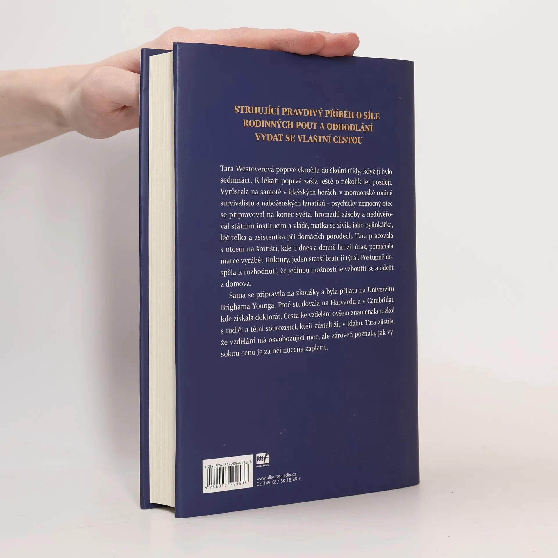Tara Westoverová poprvé vkročila do školní třídy, když jí bylo sedmnáct. K lékaři poprvé zašla ještě o několik let později. Vyrůstala na samotě v idažských horách, v mormonské rodině survivalistů a náboženských fanatiků – psychicky nemocný otec se připravoval na konec světa, hromadil zásoby a nedůvěřoval státním institucím a vládě, matka se živila jako bylinkářka, léčitelka a asistentka při domácích porodech. Tara pracovala s otcem na šrotišti, kde jí dnes a denně hrozil úraz, pomáhala matce vyrábět tinktury, jeden starší bratr ji týral. Postupně dospěla k rozhodnutí, že jedinou možností je vzbouřit se a odejít z domova. Sama se připravila na přijímací zkoušky a byla přijata na Univerzitu Brighama Younga. Poté studovala na Harvardu a v Cambridgi, kde získala doktorát. Cesta ke vzdělání ovšem znamenala rozkol s rodiči a těmi sourozenci, kteří zůstali žít v Idahu. Tara zjistila, že vzdělání má osvobozující moc, ale zároveň poznala, jak vysokou cenu je za něj nucena zaplatit. Strhující memoár o procesu uvědomování si sebe sama, odhodlání, osobním rozvoji a rodinné loajalitě se okamžitě stal bestsellerem, patřil k oblíbeným knihám Baracka Obamy za rok 2018 a časopis TIME Taru Westoverovou zařadil mezi 100 nejvlivnějších osobností pro rok 2019.