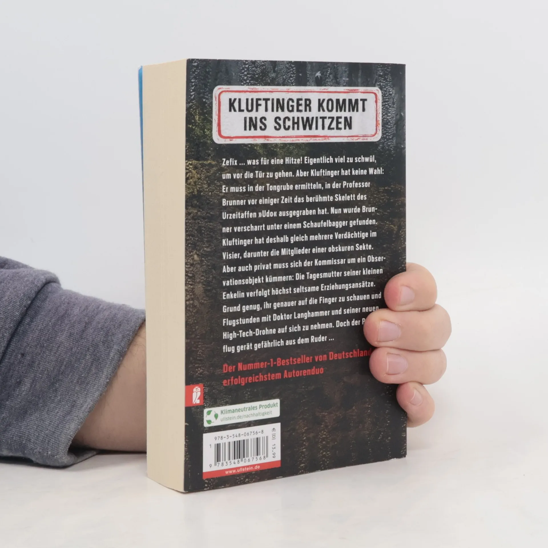 Kluftinger kommt ins Schwitzen Zefix ... was für eine Hitze! Eigentlich viel zu schwül, um vor die Tür zu gehen. Aber Kluftinger hat keine Wahl: Er muss in der Tongrube ermitteln, in der Professor Brunner vor einiger Zeit das berühmte Skelett des Urzeitaffen „Udo“ ausgegraben hat. Nun wurde Brunner verscharrt unter einem Schaufelbagger gefunden. Der Wissenschaftler, der mit seinem Fund beweisen wollte, dass die Wiege der Menschheit im Allgäu liegt, hatte viele Feinde. Kluftinger hat deshalb gleich mehrere Verdächtige im Visier, darunter die Mitglieder einer obskuren Sekte. Aber auch privat muss sich der Kommissar um ein Observationsobjekt kümmern: Die Tagesmutter seiner kleinen Enkelin verfolgt höchst seltsame Erziehungsansätze. Grund genug, ihr genauer auf die Finger zu schauen und Flugstunden mit Doktor Langhammer und seiner neuen High-Tech-Drohne auf sich zu nehmen. Doch der Probeflug gerät gefährlich aus dem Ruder ...