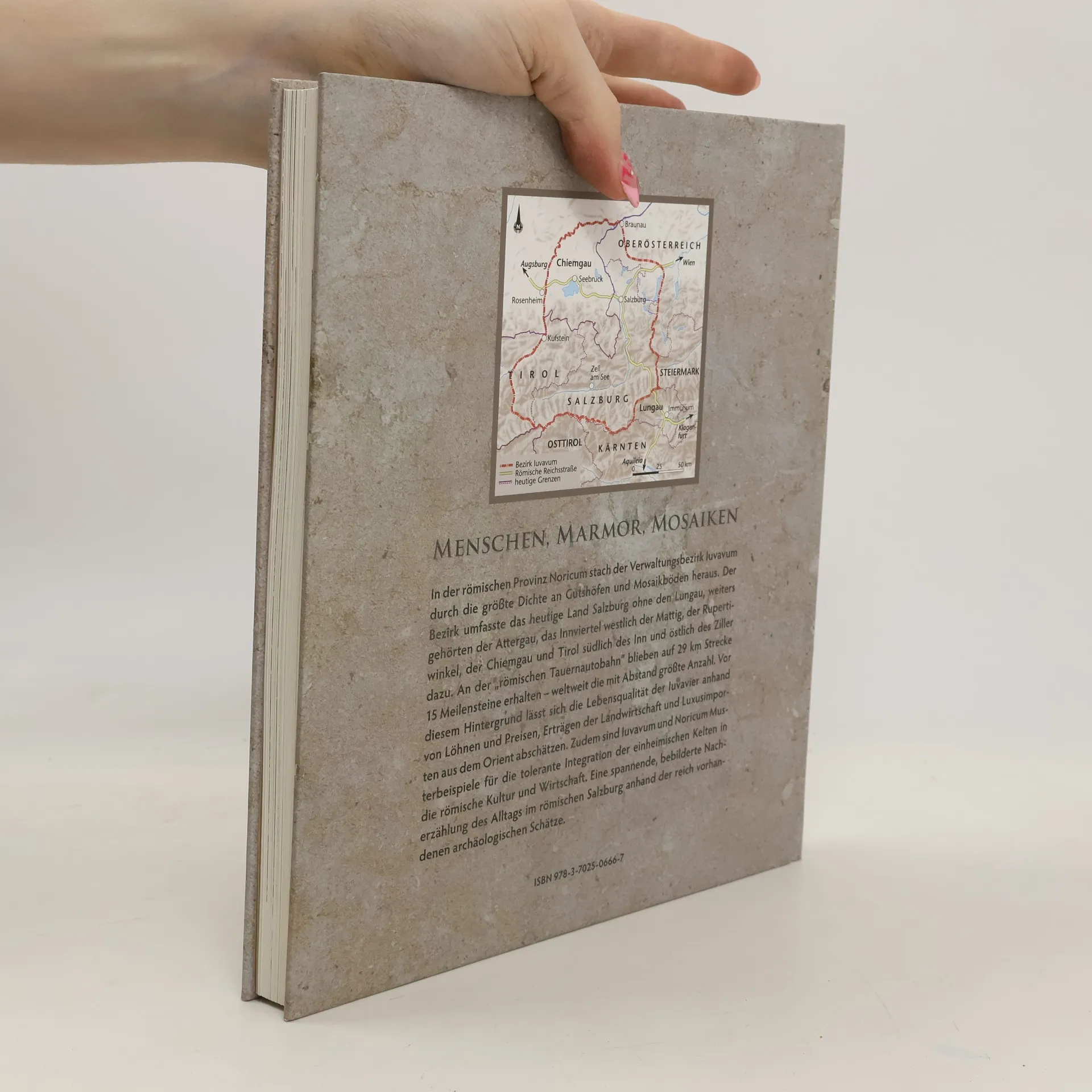 Menschen, Marmor, Mosaiken In der römischen Provinz Noricum stach der Verwaltungsbezirk Iuvavum durch die größte Dichte an Gutshöfen und Mosaikböden heraus. Der Bezirk umfasste das heutige Land Salzburg ohne den Lungau, weiters gehörten der Attergau, das Innviertel westlich der Mattig, der Rupertiwinkel, der Chiemgau und Tirol südlich des Inn und östlich des Ziller dazu. Hier lebten Sklaven, die sich sogar teure Grabsteine leisten konnten. An der „römischen Tauernautobahn“ blieben auf 29 Kilometern Strecke 15 Meilensteine erhalten – weltweit die mit Abstand größte Anzahl. Vor diesem Hintergrund lässt sich die Lebensqualität der Iuvavier anhand von Löhnen und Preisen, Erträgen der Landwirtschaft und auch Luxusimporten aus dem Orient abschätzen. Zudem sind Iuvavum und Noricum Musterbeispiele für die tolerante Integration der einheimischen Kelten in die römische Kultur und Wirtschaft. Eine spannende, bebilderte Nacherzählung des Alltags im römischen Salzburg anhand der reich vorhandenen archäologischen Schätze.