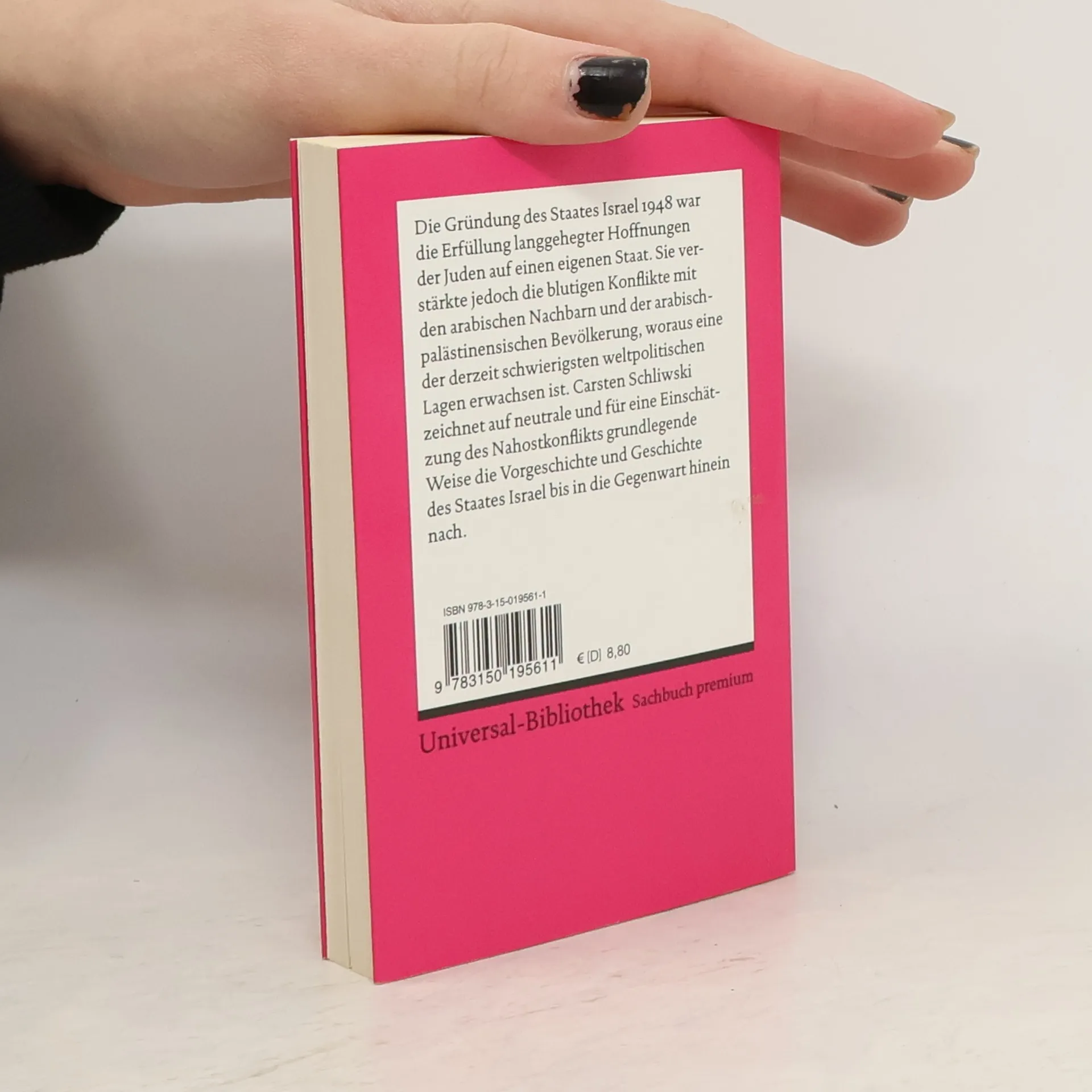 Die Gründung des Staates Israel 1948 war die Erfüllung langgehegter Hoffnungen der Juden auf einen eigenen Staat. Sie verstärkte jedoch die blutigen Konflikte mit den arabischen Nachbarn und der arabisch-palästinensischen Bevölkerung, woraus eine der derzeit schwierigsten weltpolitischen Lagen erwachsen ist. Carsten Schliwski zeichnet auf neutrale und für eine Einschätzung des Nahostkonflikts grundlegende Weise die Vorgeschichte und Geschichte des Staates Israel bis in die Gegenwart hinein nach.