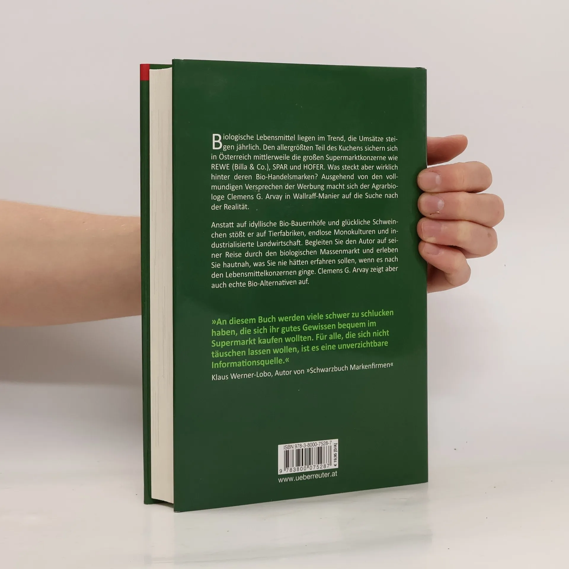 > Bio< ist Trend, die Umsätze steigen jährlich. Den größten Teil des Kuchens sichern sich mittlerweile die Handelsmarken der großen Supermarktketten. Was steckt aber wirklich hinter diesen Bio-Marken? Ausgehend von den vollmundigen Versprechen der Werbung macht sich der Agrarbiologe Clemens G. Arvay auf die Suche nach der Realität: Anstatt auf idyllische Biobauernhöfe mit glücklichen Tieren stößt er auf endlose Monokulturen und industrialisierte Landwirtschaft und deckt auf, wie große Konzerne ihre Kunden täuschen. Aber er zeigt auch positive Beispiele von kleinen Bio-betrieben auf, die eine echte Alternative für Konsumenten sind.