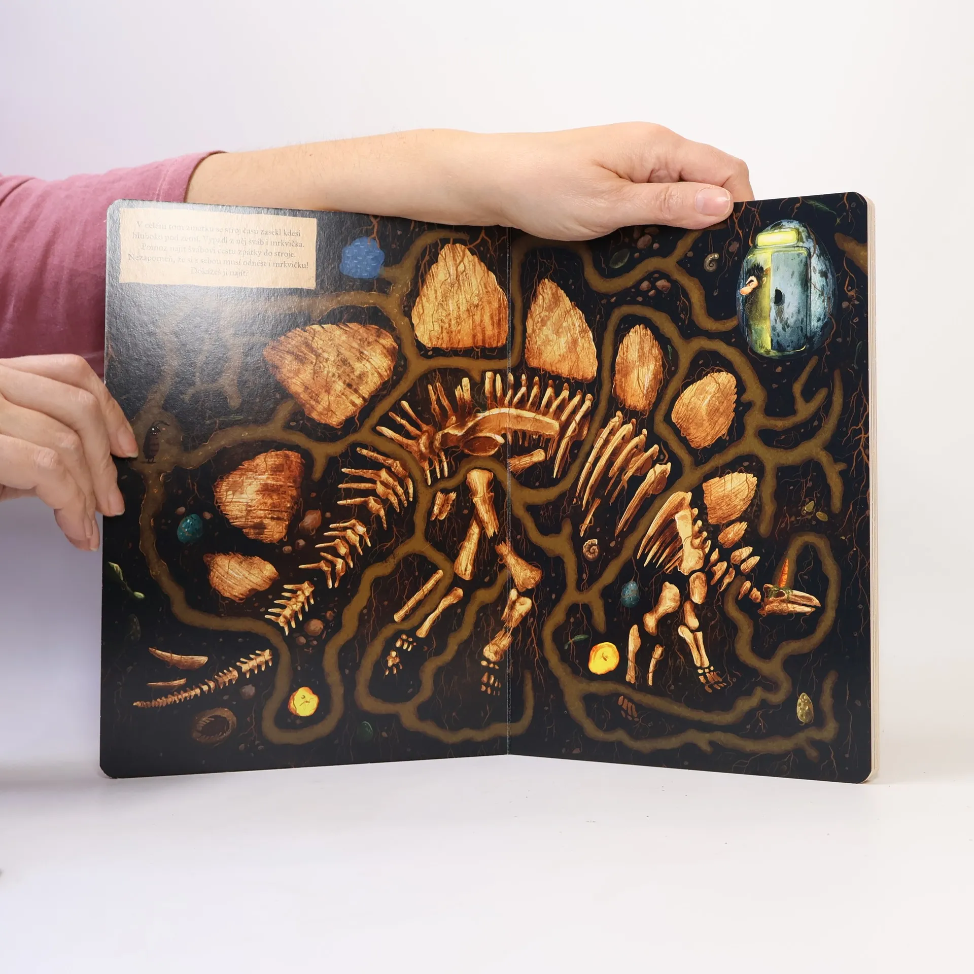 Nerozlučná dvojice kamarádů Vousáč a švábice se vydávají na cestu časem. Je to povedená dvojice – představte si pračlověka a švábí dámu, kteří zabloudí do země dinosaurů. Chudáčci, jsou z těch velkých obrů celí paf, postupně se ale dozvídají spoustu zajímavých, úžasných poznatků o podivuhodných bytostech, kteří – musí uznat – jsou docela sympaťáci. Zábavné a naučné leporelo je určeno dětem od 2 do šesti let.