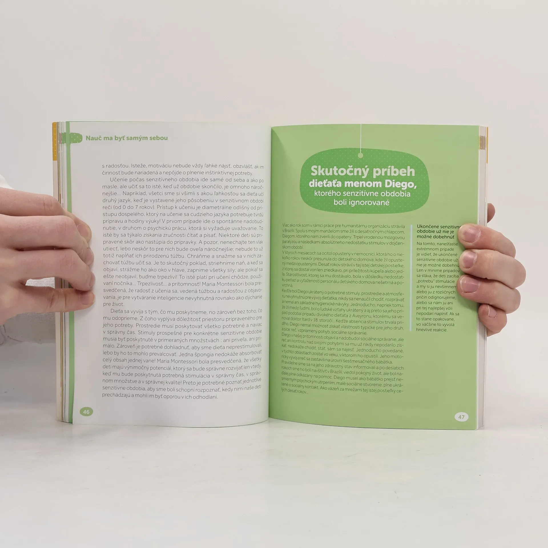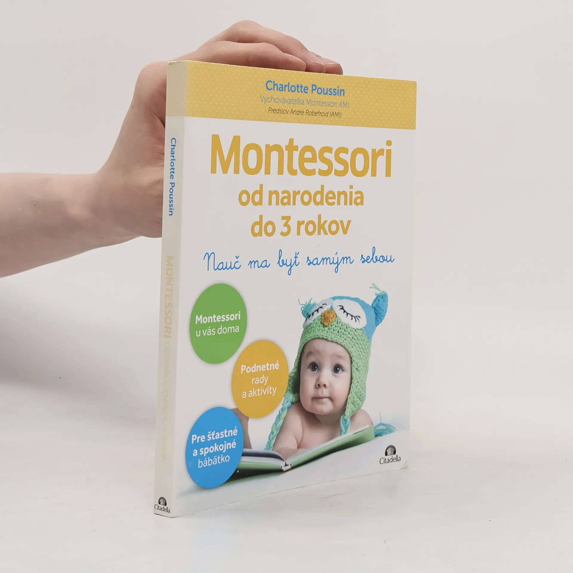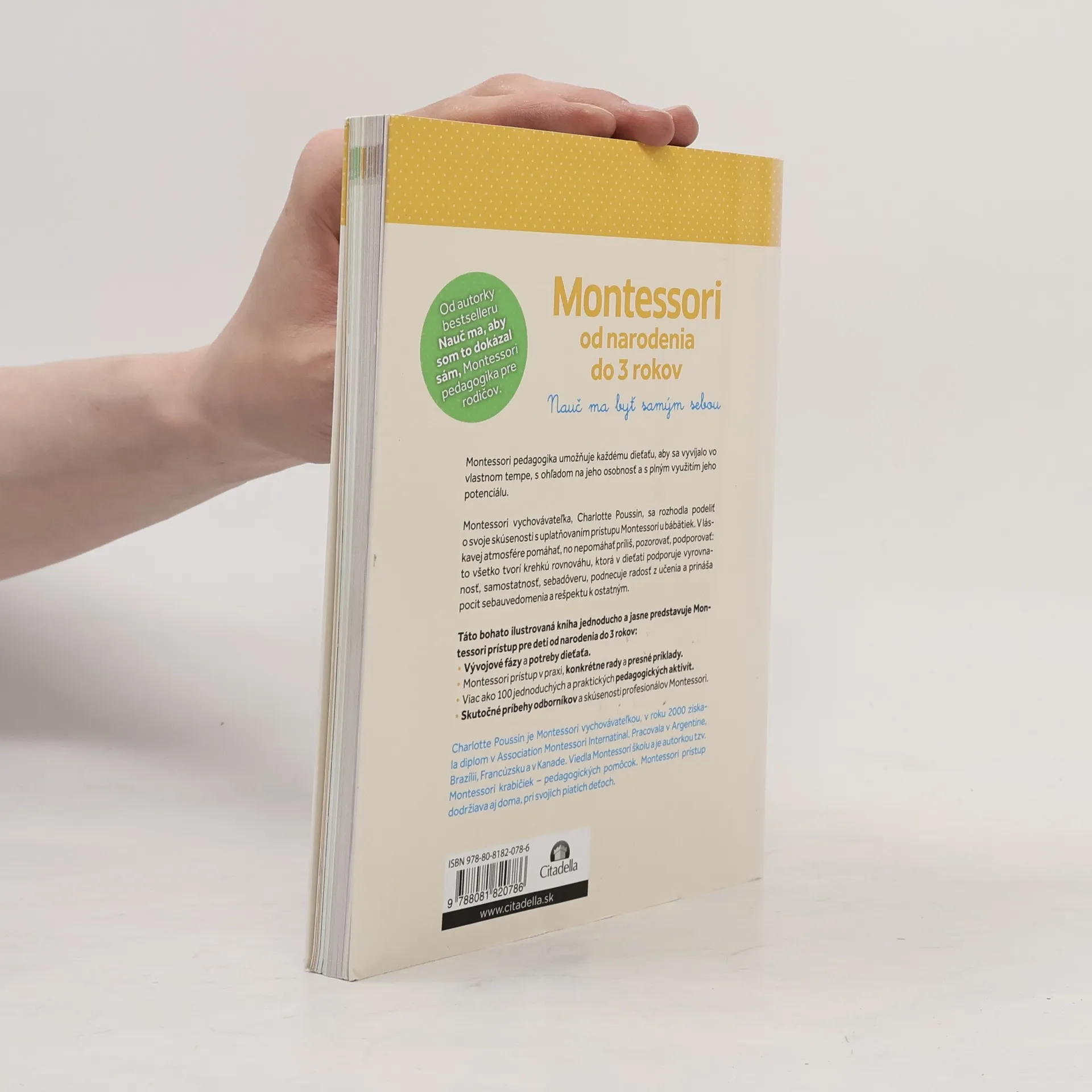 Montessori pedagogika umožňuje každému dieťaťu, aby sa vyvijalo vo vlastnom tempe, s ohľadom na jeho osobnosť a s plným využitím jeho potenciálu. Montessori vychovávateľka, Charlotte Poussin, sa rozhodla podeliť o svoje skúsenosti s uplatňovaním prístupu Montessori u bábätiek. V láskavej atmosfére pomáhať, no nepomáhať príliš, pozorovať, podporovať: to všetko tvorí krehkú rovnováhu, ktorá v dieťati podporuje vyrovnanosť,lsamostatnosť, sebadôveru, podnecuje radosť z učenia a prináša pocit sebauvedomenia a rešpektu k ostatným. Táto bohato ilustrovaná kniha jednoducho a jasne predstavuje Montessori prístup pre deti od narodenia do 3 rokov: - Vývojové fázy a potreby dieťata. - Montessori prístup v praxi, konkrétne rady a presné príklady. - Viac ako 100 jednoduchých a praktických pedagogických aktivít. - Skutočné príbehy odborníkov a skúsenosti profesionálov Montessori.