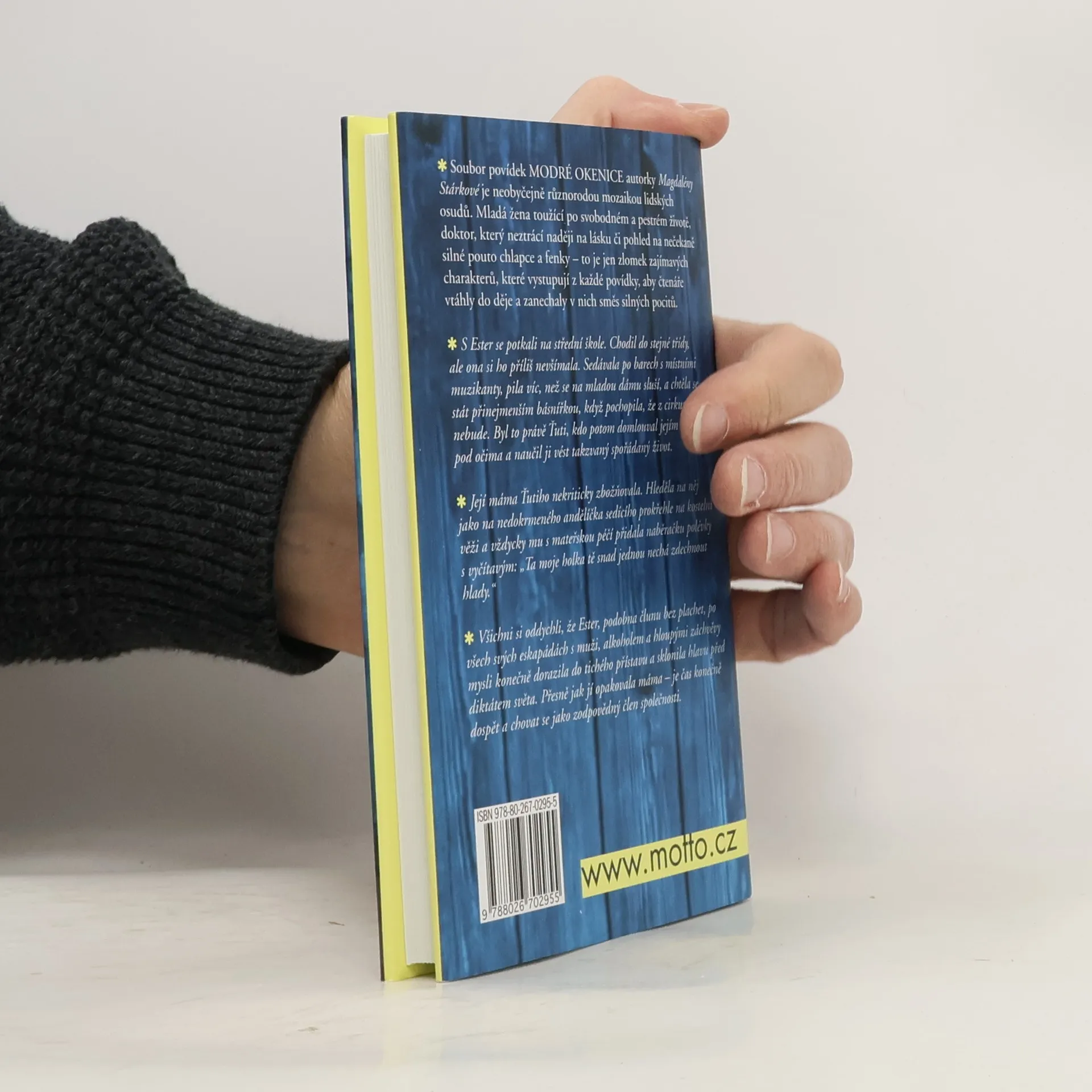 Soubor povídek Modré okenice autorky Magdalény Stárkové je neobyčejně různorodou mozaikou lidských osudů. Mladá žena toužící po svobodném a pestrém životě, doktor, který neztrácí naději na lásku či pohled na nečekaně silné pouto chlapce a fenky – to je jen zlomek zajímavých charakterů, které vystupují z každé povídky, aby čtenáře vtáhly do děje a zanechaly v každém směs silných pocitů. - S Ester se potkali na střední škole. Chodil do stejné třídy, ale ona si ho příliš nevšímala. Sedávala po barech s místními muzikanty, pila víc, než se na mladou dámu sluší, a chtěla se stát přinejmenším básnířkou, když pochopila, že z cirkusu nic nebude. Byl to právě Ťuti, kdo potom domlouval jejím kruhům pod očima a naučil ji vést takzvaný spořádaný život.
