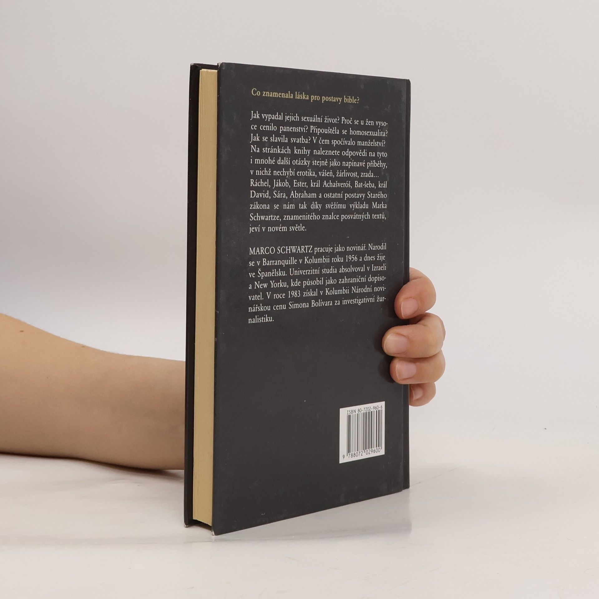 Co znamenala láska pro postavy bible? Jak vypadal jejich sexuální život? Proč se u žen vysoce cenilo panenství? Připouštěla se homosexualita? Jak se slavila svatba? V čem spočívalo manželství? Na stránkách knihy naleznete odpovědi na tyto i mnohé další otázky stejně jako napínave příběhy, v nichž nechybí erotika, vášeň, žárlivost, zrada... Ráchel, Jákob, Ester, král Achašveróš, Batšeba, král David, Sára, Abraham a ostatní postavy Starého zákona se nám tak díky svěžímu výkladu Marka Schwartze, znamenitého znalce posvátných textů, jeví v novém světle. Vydání první