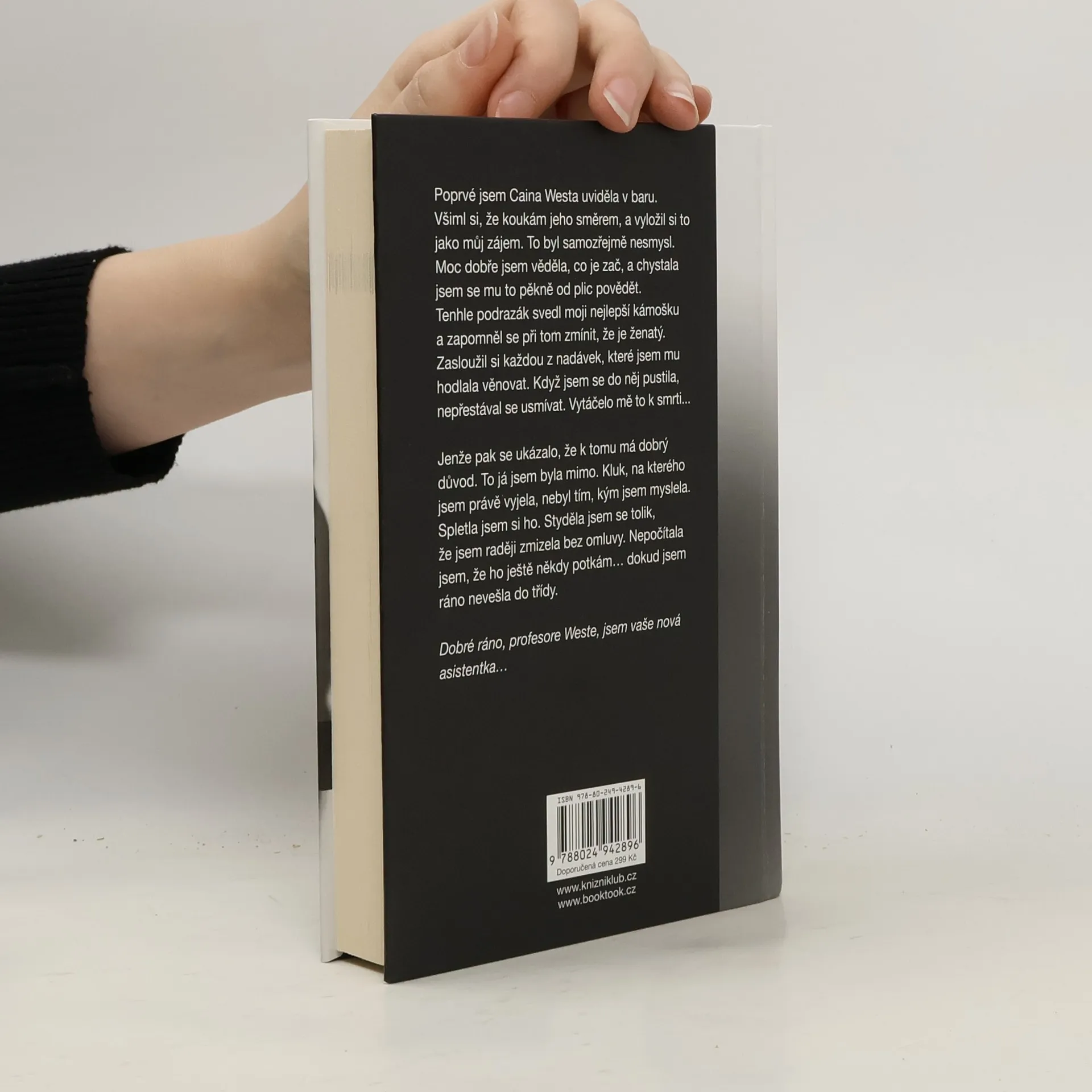 Poprvé jsem Caina Westa uviděla v baru. Všimnul si, že koukám jeho směrem, a vyložil si to tak, že mám zájem. To byl samozřejmě nesmysl. Moc dobře jsem věděla, co je zač, a chystala jsem se mu to pěkně od plic povědět. Tenhle podrazák svedl moji nejlepší kámošku a zapomněl se přitom zmínit, že je ženatý. Zasloužil si každou jednu nadávku, kterou jsem mu plánovala věnovat. Když jsem se do něj pustila, nepřestával se usmívat. Vytáčelo mě to k smrti. Jenže pak se ukázalo, že k tomu má dobrý důvod. To já jsem byla mimo. Kluk, na kterého jsem právě vyjela, nebyl tím, kým jsem myslela. Spletla jsem si ho. Styděla jsem se tolik, že jsem raději zmizela bez omluvy. Nepočítala jsem, že ho ještě někdy potkám…¬ dokud jsem ráno nevešla do třídy. Dobré ráno, profesore Weste, jsem vaše nová asistentka…