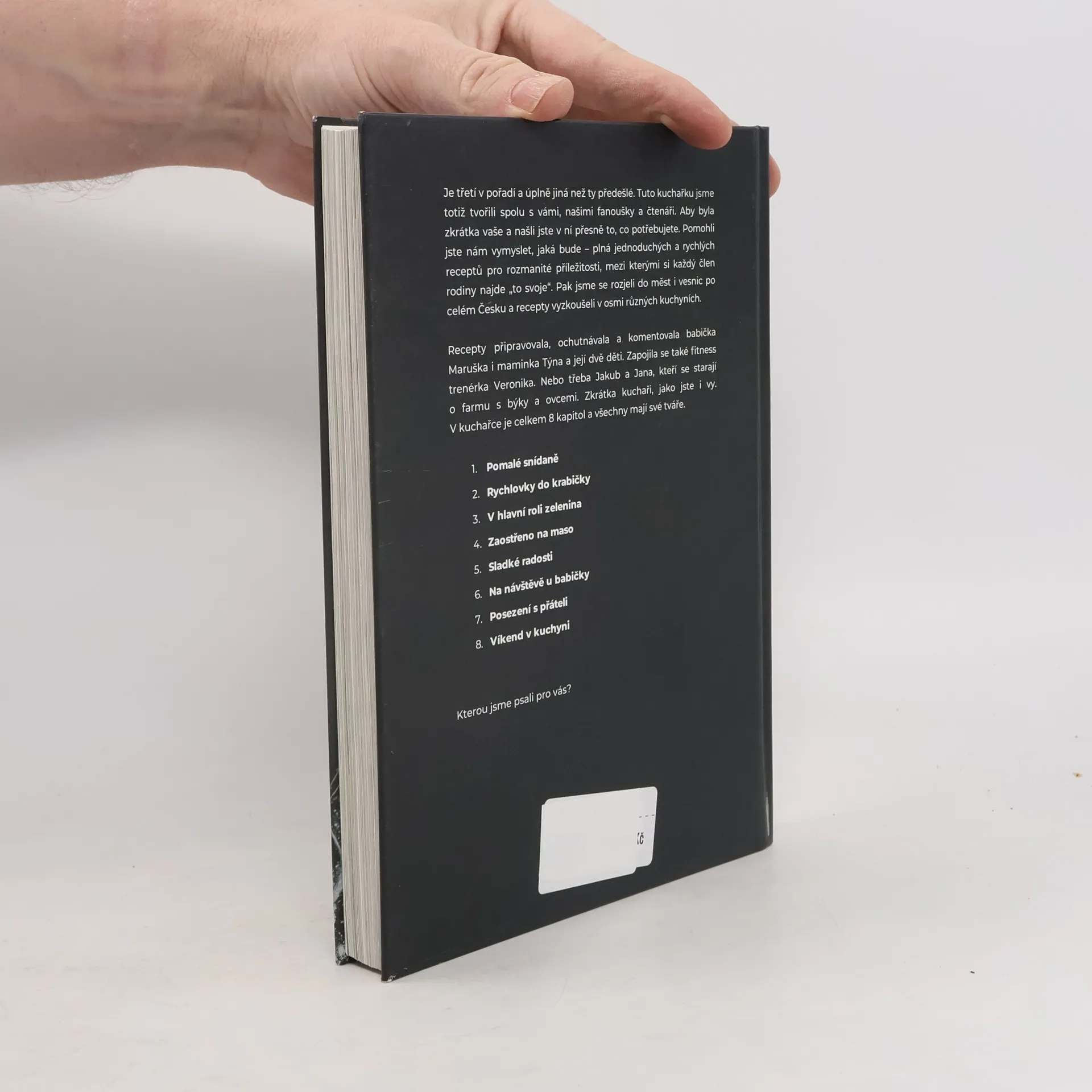 Máme za sebou pěkný kus cesty. Slíbili jsme, že připravíme kuchařku podle vašich přání. Tak jsme pracovali 8 měsíců, ujeli 1 438 kilometrů, vařili v osmi kuchyních po různých koutech Česka – a nezapomněli se radit s vámi. Děkujeme vám za pomoc a podporu! V kuchařce najdete od každého něco – péct budete s mámou Týnou a jejími dětmi. S babičkou Maruškou a její vnučkou ochutnáte tradiční recepty v netradiční podobě. A s fitness trenérkou Verčou se podíváte na to, jaké recepty si můžete zabalit s sebou do krabičky. V celkem 8 kapitolách najdete 110 receptů pro různé příležitosti.