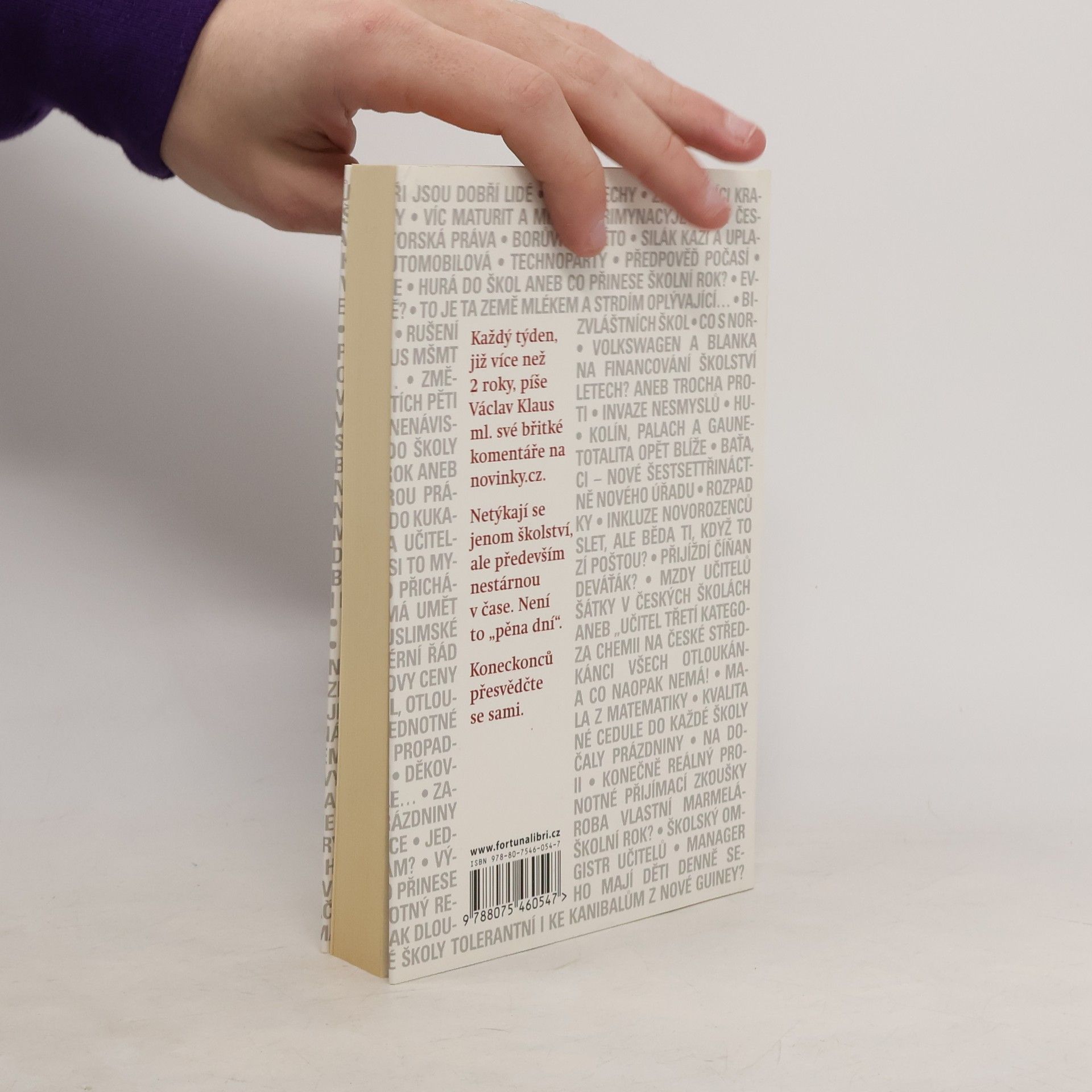 Každý týden, již více než 2 roky, píše Václav Klaus ml. své břitké komentáře na novinky.cz. Netýkají se jenom školství, ale především nestárnou v čase. Není to "pěna dní". Koneckonců přesvědčte se sami. Z předmluvy Petra Nárožného: …Tahle kniha se poctivě snaží demaskovat úplně novou moderní totalitu, která už delší dobu, pro mnohé bohužel nepozorovaně, přichází nejen k nám, ale do celé staré Evropy. Tentokráte má masku hodné a starostlivé mladé paní, která nechce nic jiného, než dobro pro nás pro všechny. A má-li to být sociálně spravedlivé, musí to dobro být pro všechny stejné. Jaké to bude dobro a hlavně, co bude s těmi, co ho nechtějí, to rozhodne ta hodná paní. Ale né hned, až později. A já dodávám, že to už bude pozdě. To už totiž ta hodná mladá paní odloží masku a ukáže se, že je to zase ta zlá, krutá stařena, která v Evropě už dvakrát byla. A vždycky převlečená za něco jiného. Moc bych si přál, abych neměl pravdu…