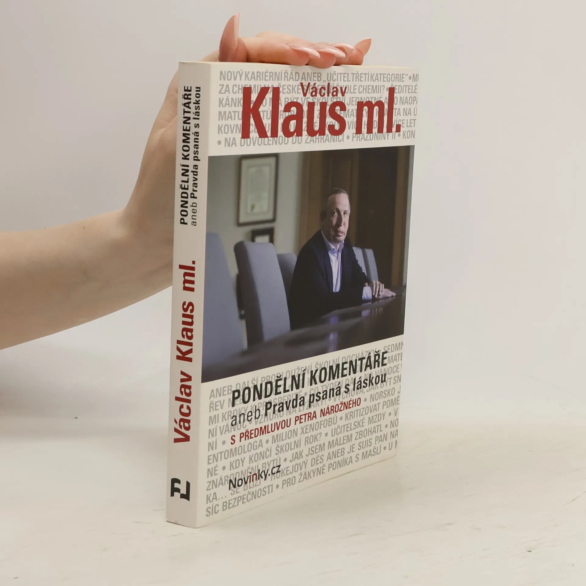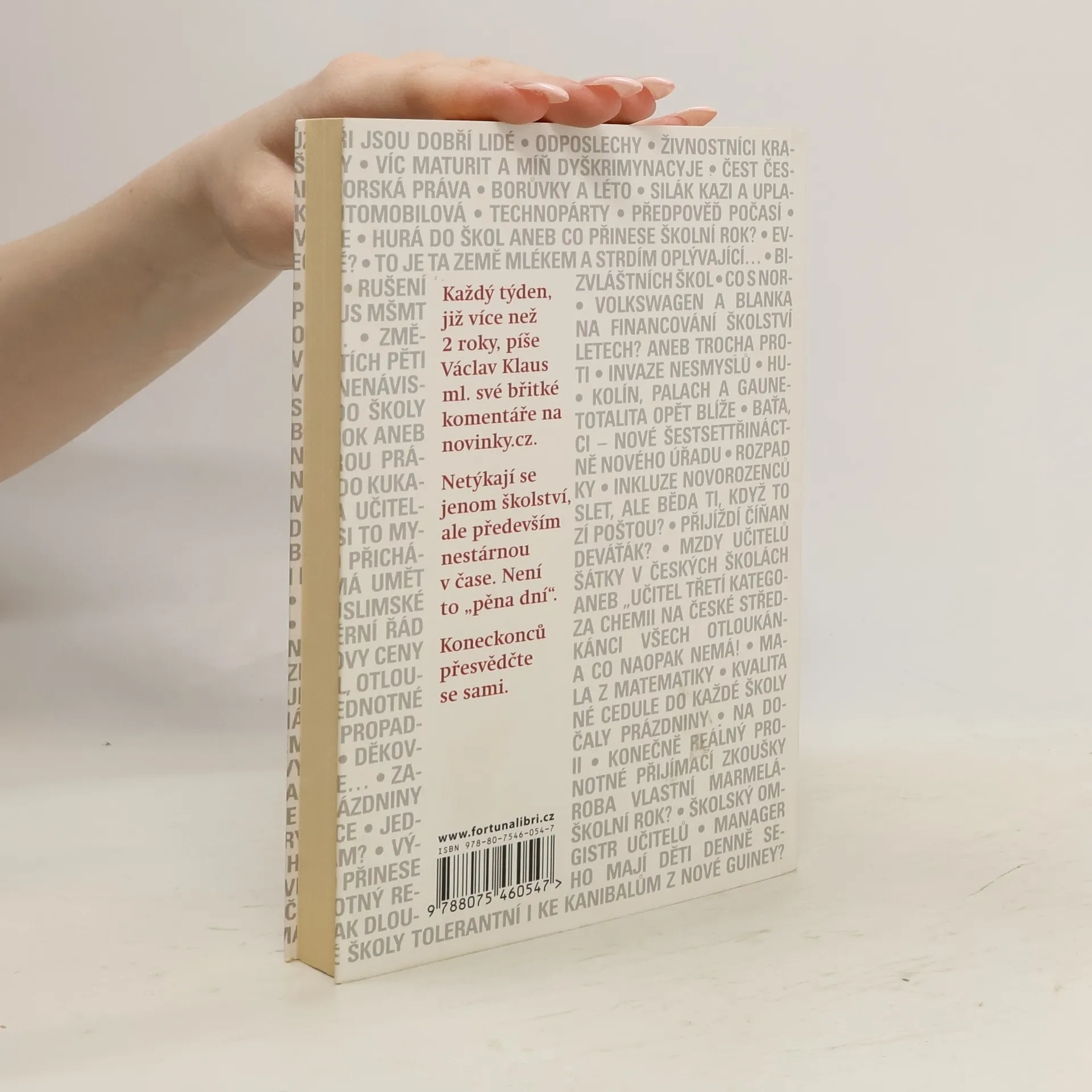 Každý týden, již více než 2 roky, píše Václav Klaus ml. své břitké komentáře na novinky.cz. Netýkají se jenom školství, ale především nestárnou v čase. Není to "pěna dní". Koneckonců přesvědčte se sami. Z předmluvy Petra Nárožného: …Tahle kniha se poctivě snaží demaskovat úplně novou moderní totalitu, která už delší dobu, pro mnohé bohužel nepozorovaně, přichází nejen k nám, ale do celé staré Evropy. Tentokráte má masku hodné a starostlivé mladé paní, která nechce nic jiného, než dobro pro nás pro všechny. A má-li to být sociálně spravedlivé, musí to dobro být pro všechny stejné. Jaké to bude dobro a hlavně, co bude s těmi, co ho nechtějí, to rozhodne ta hodná paní. Ale né hned, až později. A já dodávám, že to už bude pozdě. To už totiž ta hodná mladá paní odloží masku a ukáže se, že je to zase ta zlá, krutá stařena, která v Evropě už dvakrát byla. A vždycky převlečená za něco jiného. Moc bych si přál, abych neměl pravdu…