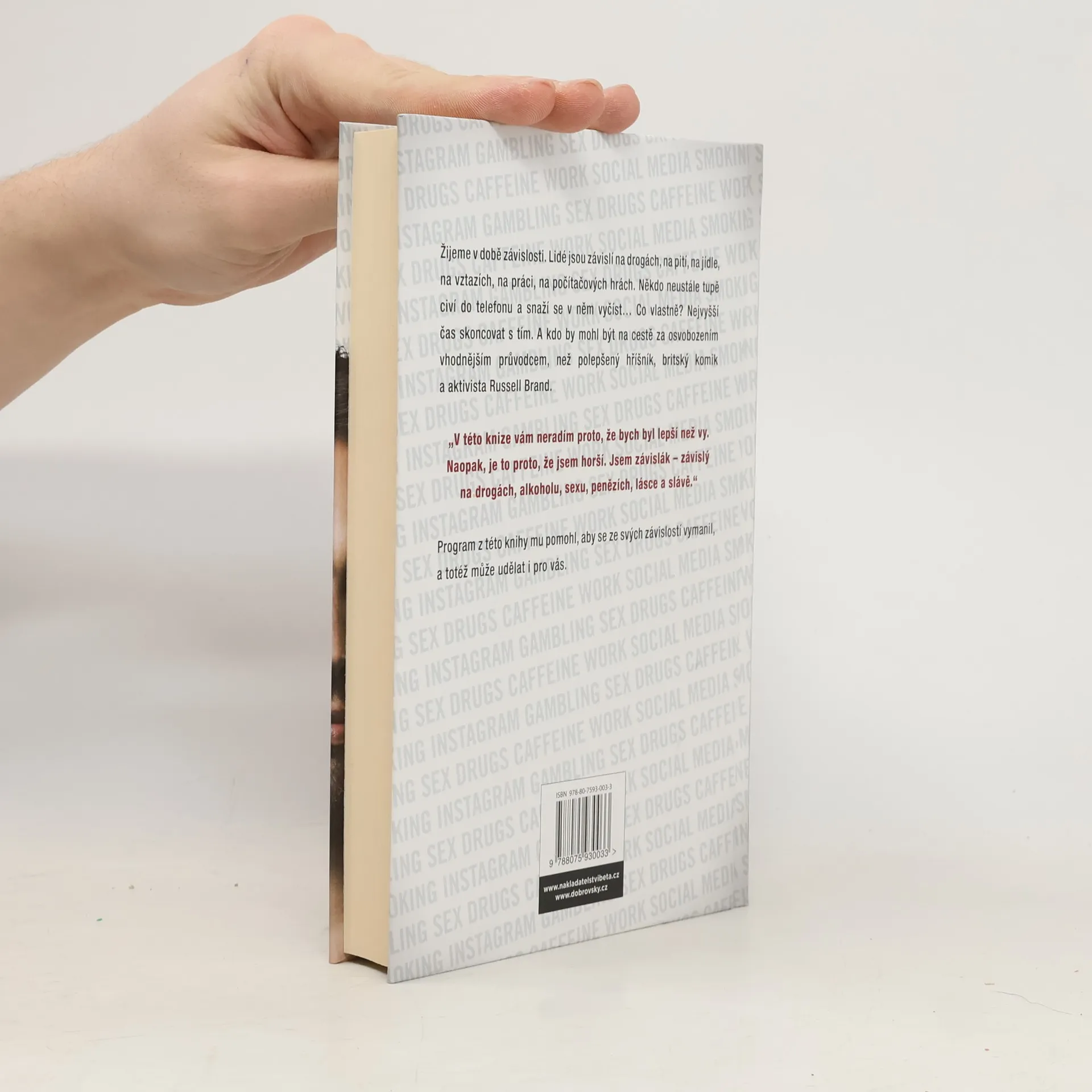 Žijeme v době závislosti. Je to věc natolik zakořeněná a všeobjímající a všudypřítomná, že si ani neuvědomíte, že ji máte – pokud nemáte to štěstí, že jste extrémním případem. Lidé jsou závislí na pití, na jídle, na vztazích, na práci, někdo neustále tupě civí do telefonu a snaží se v něm vyčíst…, co vlastně? Nejvyšší čas skoncovat s tím. A kdo by mohl být na cestě za osvobozením vhodnějším průvodcem, než polepšený hříšník, britský komik a aktivista Russell Brand. Program z této knihy mu pomohl, aby se ze všech závislostí vymanil, a totéž může udělat i pro vás. Nenabízí nic menšího než, že se osvobodíte od zahleděnosti do sebe sama, získáte novou perspektivu a zbavíte se iluze toho, že trpíte. „V této knize vám neradím proto, že bych byl lepší než vy. Naopak, je to proto, že jsem horší. Jsem závislák – závislý na drogách, alkoholu, sexu, penězích, lásce a slávě.“