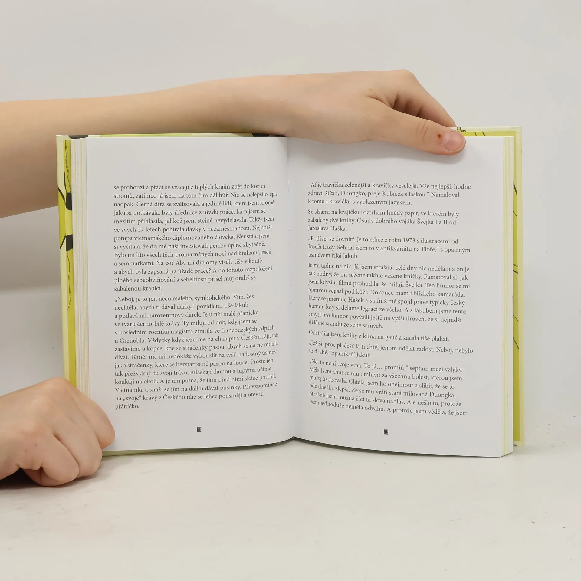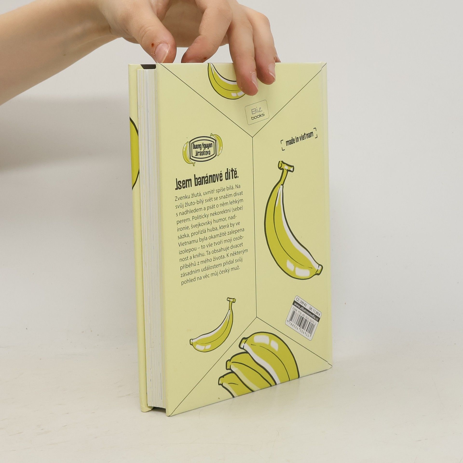 Jsem banánové dítě – zvenku žlutá, uvnitř spíše bílá. Na svůj žluto-bílý svět se snažím dívat s nadhledem a psát o něm lehkým perem. Politicky nekorektní (sebe)ironie, švejkovský humor, nadsázka, prořízlá huba, která by ve Vietnamu byla okamžitě zalepena izolepou – to vše tvoří moji osobnost a knihu. Ta obsahuje dvacet příběhů z mého života. Píšu o svých rodičích, o tom, jak mě vychovali. Píšu o tom, jak jsem se s tím, jak mě vychovali, prodírala životem v české společnosti. Píšu také o tom, jak jsem si v životě nevěděla rady a chtěla to vyřešit útěkem do Francie. Píšu o hledání muže, o vyhazovu z práce, o depresích a mániích, o Vietnamu, o babičce, zkrátka o všem, co se mi z dnešního pohledu zdá pro můj život důležité. K některým zásadním událostem přidal svůj pohled na věc můj český muž. O autorce: Papírově jsem čistokrevná Vietnamka, ale míchá se ve mně jak asijská, tak evropská kultura. Jsem totiž Vietnamka made in Czechoslovakia. Byla jsem počata v Litvínově, narodila jsem se v Hanoji a v osmi letech jsem se s rodiči odstěhovala do východních Čech. Bydlím s českým manželem v Lysé a od narození mám na hlavě dvě lysinky. Miluji švejkovský humor, nadsázku a politicky nekorektní sarkasmus skoro stejně jako stračenky z Českého ráje a cukrovou třtinu z hanojského trhu.