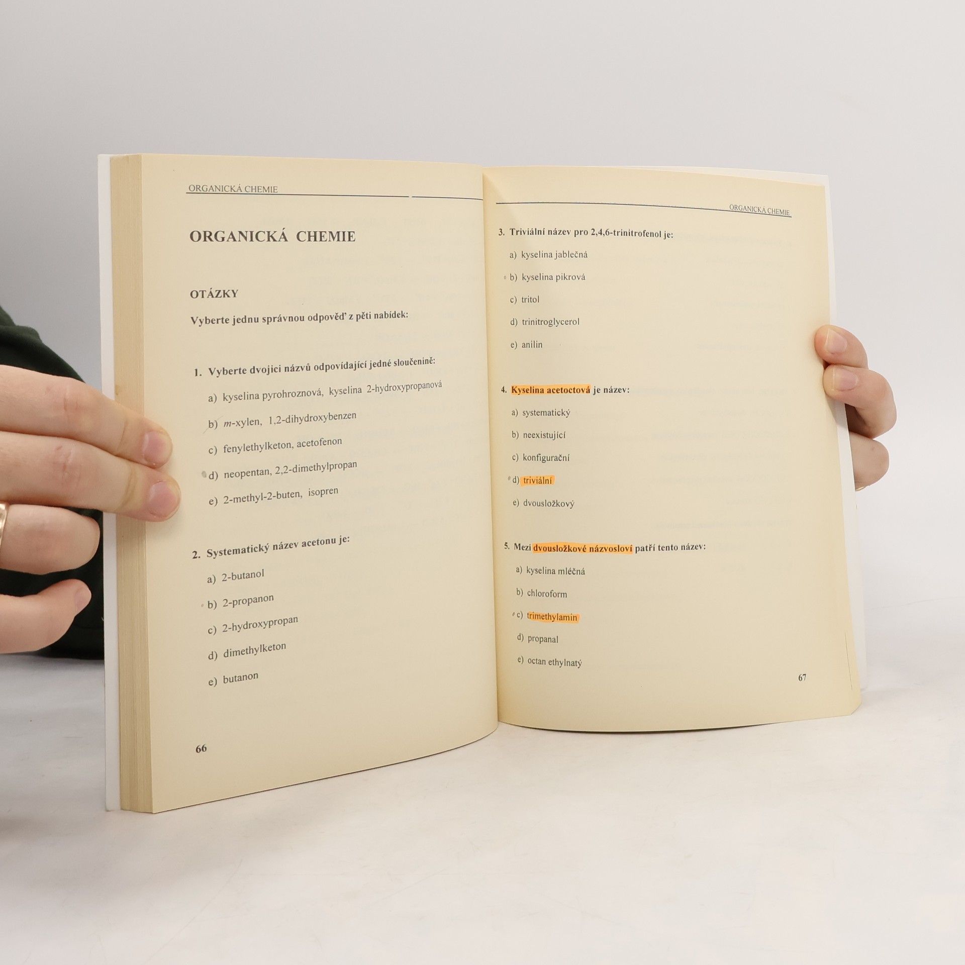 Předkládaná kniha obsahuje soubor modelových otázek a příkladů z předmětu středoškolské chemie. Tématické části knihy byly voleny tak, aby zahrnuly oblast učiva předmětu chemie požadovanou k přijímacím zkouškám především na lékařské fakulty a vysoké školy s biologickým zaměření. Z tohoto důvodu je v publikaci velká část otázek věnována organické chemii a biochemii. Současně bylo naší snahou koncipovat otázky tak, aby mohly být použity pro procvičení probraného učiva na středních školách. Publikace může sloužit také jako pomůcka pro ověření znalostí základů chemie pro studenty vysokých škol, kde chemie není hlavním oborem studia. Snažily jsme se o co nejpřesnější formulace otázek a o minimalizaci chyb, budeme vděčny za každou formální i věcnou připomínku k obsahu tohoto textu. Věříme, že najdete v této knize užitečnou studijní pomůcku, která přispěje k úspěšnému zvládnutí maturity a přijímací zkoušky na vysokou školu.... celý text