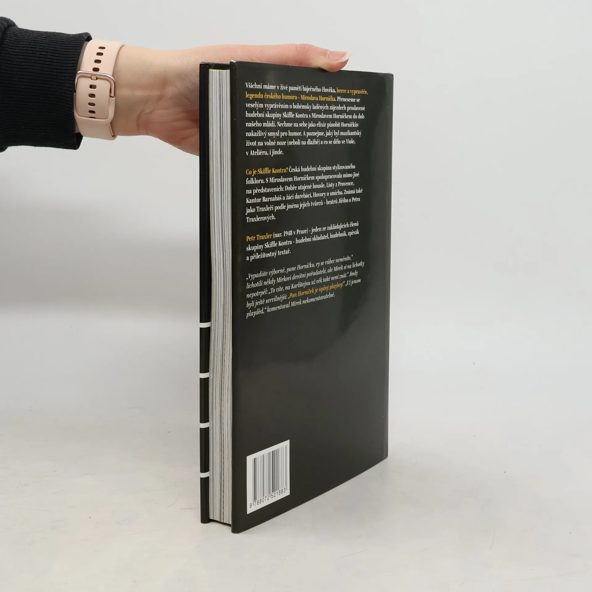 Bohatě fotograficky ilustrovaná vzpomínková kniha se spoustou humorných příběhů s Miroslavem Horníčkem. Na 80 fotografií ze 70. let. Autor byl zakládající člen skupiny Skiffle Kontra, která s M. Horníčkem jezdila po Čechách. Spolupracovali na představeních Dobře utajené housle, listy z Provence, Barnabáš a žáci darebáci, Hovory o smíchu. Kniha, která pobaví i potěší a svou výpravností se stane žádaným dárkem. Výpravná publikace bohatě fotograficky ilustrovaná uvede čtenáře do atmosféry zdařilých a hojně navštěvovaných představení Dobře utajených houslí, Listů z Provence, Barnabáše a žáků darebáků, Hovorů o smíchu, a dalších setkání v šedesátých a sedmdesátých letech velmi oblíbené skupiny Skiffle Kontra, později přejmenované na Český skiffle a v dobách normalizačních pak Žáci, jejíž hlavní náplní se stala žákovská, trubadúrská, kramářská píseň i zhudebněná poezie Vzpomínková kniha plná humorných příběhů prožitých na společných koncertech a představeních skupiny Skiffle Kontra s Miroslavem Horníčkem. Knihu sestavil autor a zakládající člen této skupiny Petr Traxler