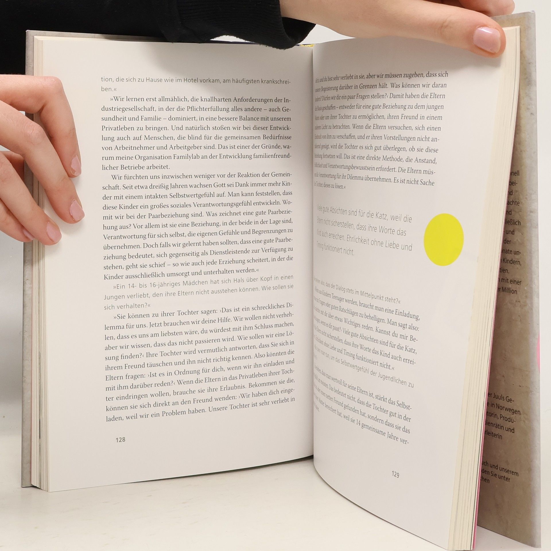 Der neue Bestseller des dänischen Querdenkers: ein hinreißendes Plädoyer dafür, sich mit Enthusiasmus und Gelassenheit auf das Abenteuer Familie einzulassen. Um die entscheidenden Grundlagen des Elternseins aufzuzeigen, beleuchtet Jesper Juul alle Phasen im Leben mit Kindern von der Geburt bis zur Pubertät. Besondere Aufmerksamkeit widmet der Bestsellerautor der Paarbeziehung. Denn kaum etwas hat mehr Einfluss auf die Zufriedenheit in der Familie als die Atmosphäre zwischen den Erwachsenen. Das Buch bietet damit die Quintessenz von Juuls Sicht auf Erziehung. Wenn Sie nur ein Buch von Jesper Juul lesen, dann dieses. Auch optisch ist sein neues Buch ein Genuss: Hochwertige Fotos des preisgekrönten Fotografen Marcel Lelienhof und das angenehme Lesebuchformat sorgen gemeinsam mit dem humorvoll-geradlinigen Stil von Jesper Juul für Lesevergnügen mit pädagogischem Tiefgang. Mehr Gelassenheit und Freude an den Kindern gibt es beim Lesen gratis dazu. Ausstattung: 2-farbig mit Fotos
