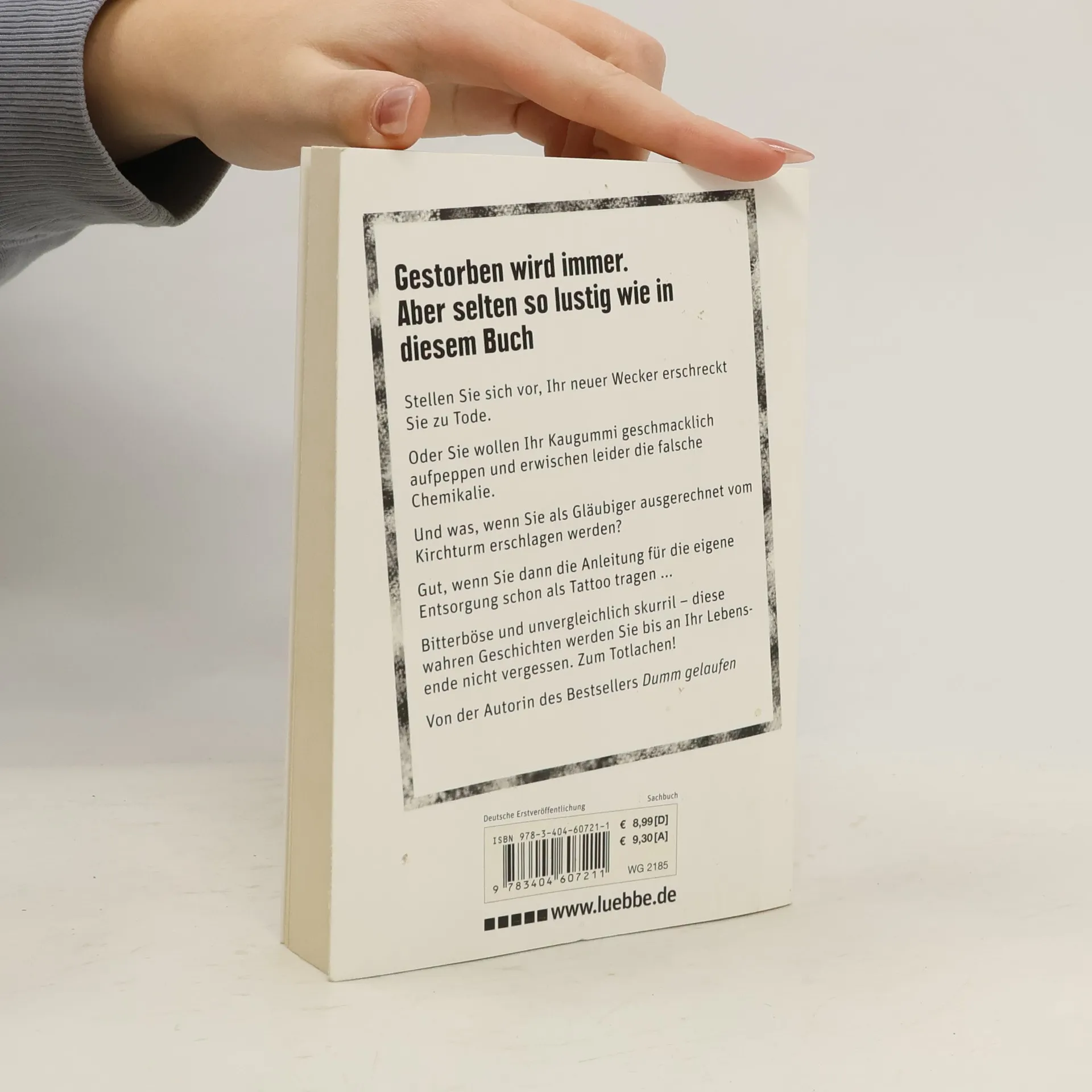 Stellen Sie sich vor, Ihr neuer Wecker erschreckt Sie zu Tode. Oder Sie wollen Ihr Kaugummi geschmacklich aufpeppen und erwischen leider die falsche Chemikalie. Und was, wenn Sie als Gläubiger ausgerechnet vom Kirchturm erschlagen werden? Gut, wenn Sie dann die Anleitung für die eigene Entsorgung schon als Tattoo tragen ... Bitterböse und unvergleichlich skurril – diese wahren Geschichten werden Sie bis an Ihr Lebensende nicht vergessen. Zum Totlachen! Von der Autorin des Bestsellers Dumm gelaufen!